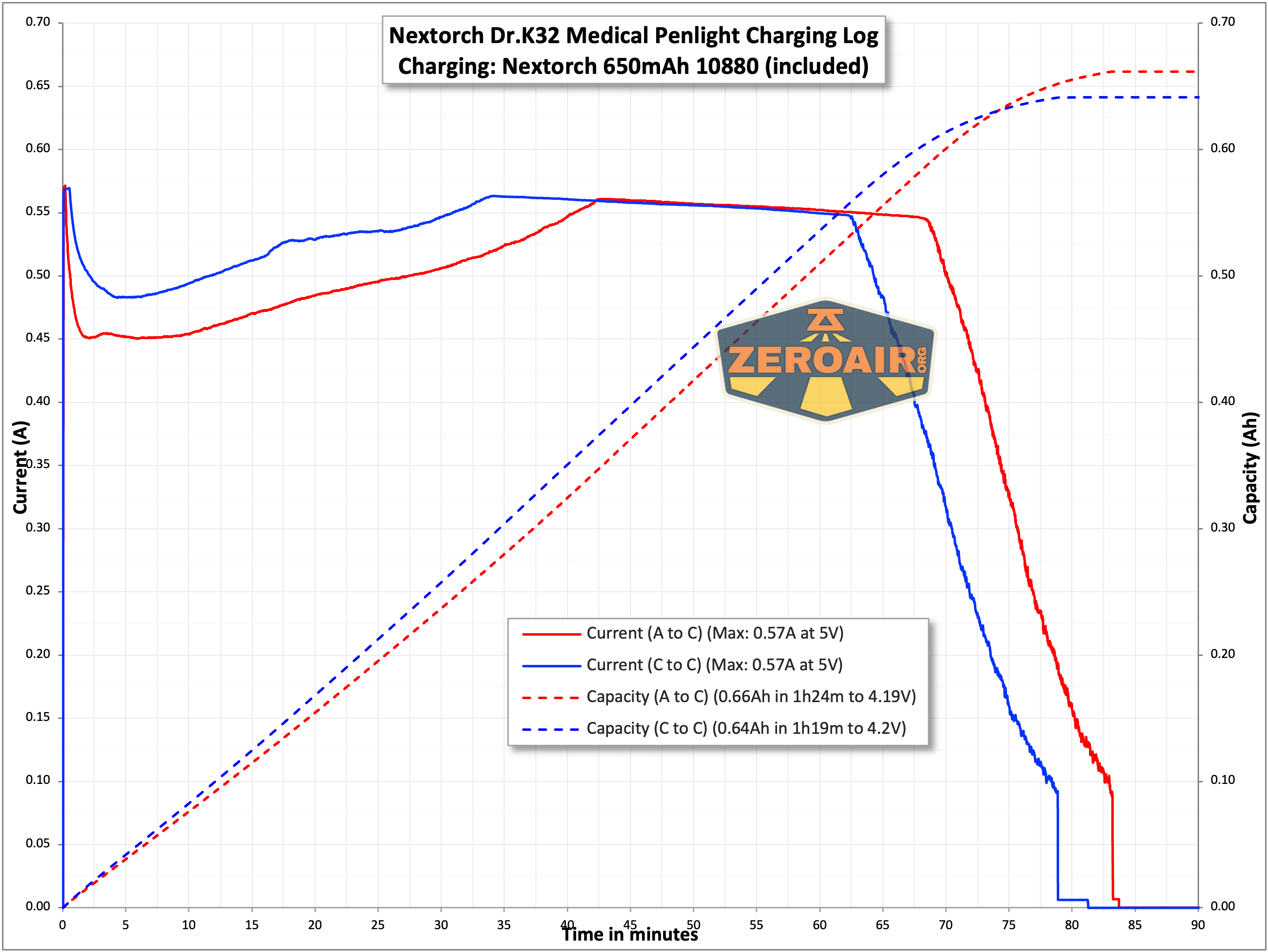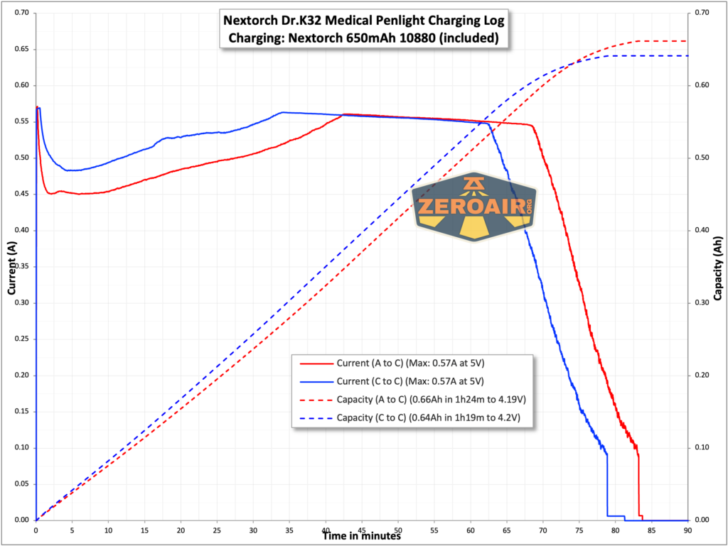 Nextorch includes a USB to USB-C charging cable. Here are a couple of charging cycles from the same Nextorch cell from the Dr.K32 Medical penlight.