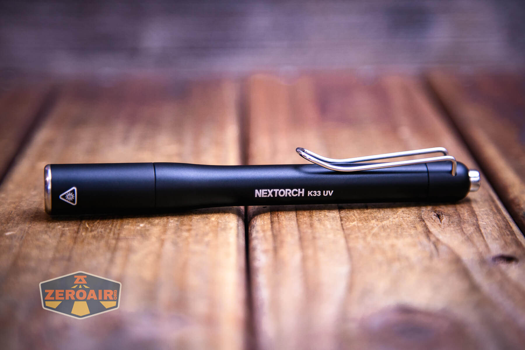 The Nextorch K33 UV penlight has a “friendly” pocket clip. It’s actually surprisingly grippy, probably due to how much curve there is in the material when the light is pocketed.