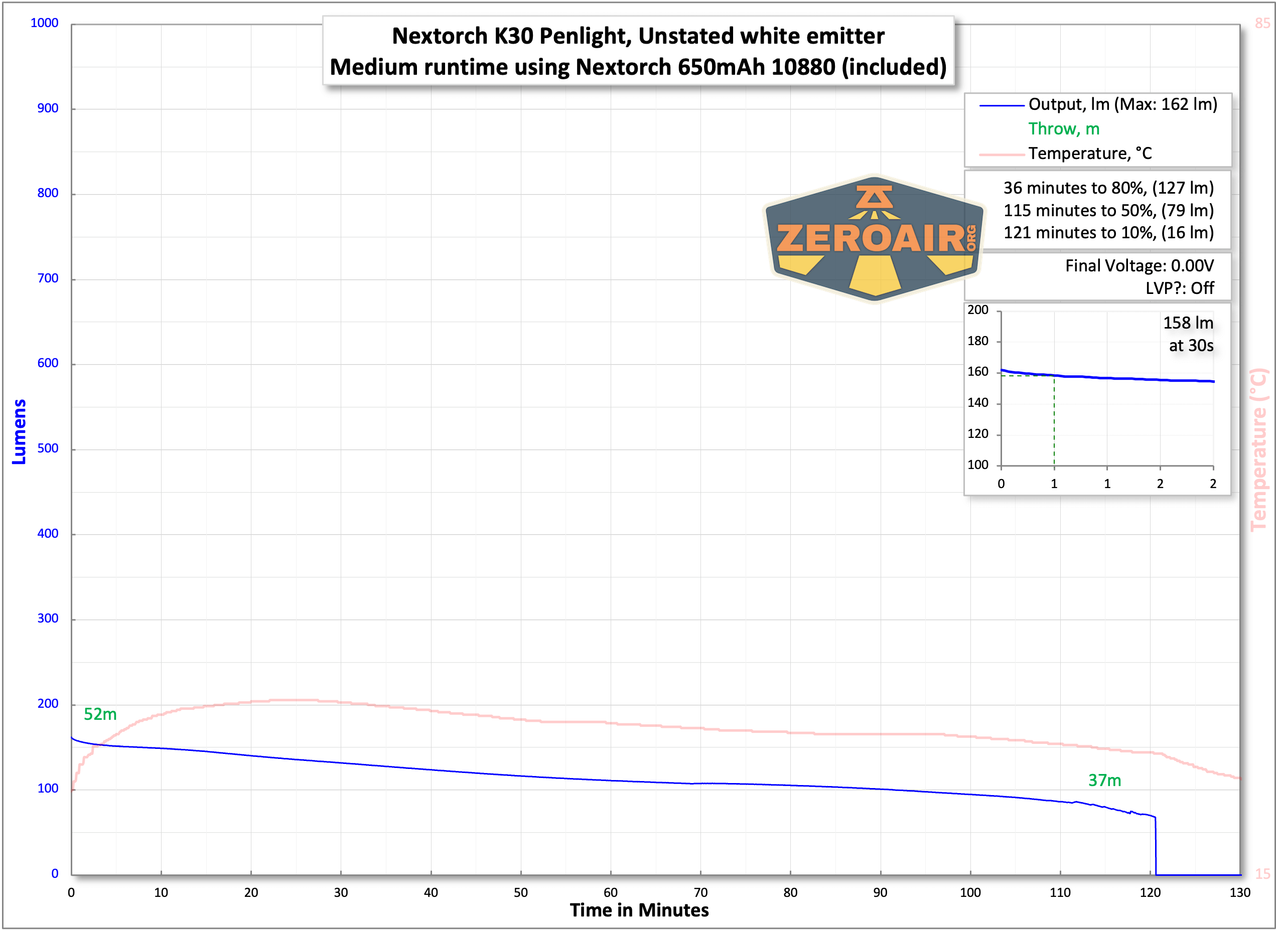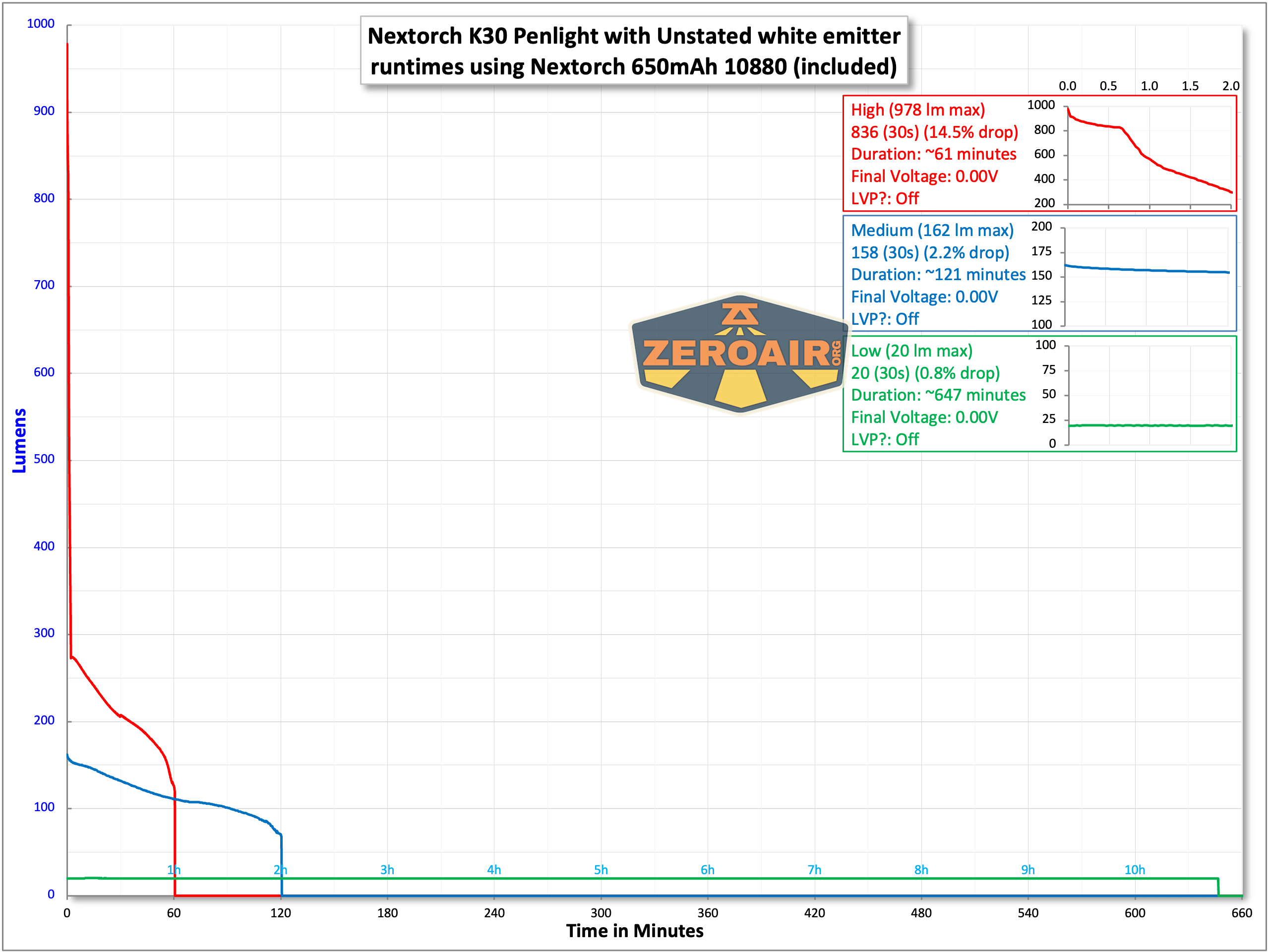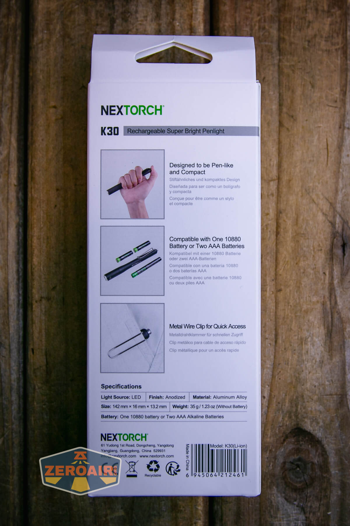 The Nextorch K30 penlight is powered by a single 10880 cell, which is included. That’s a bit of a weird size, but since it’s included we can give it a pass. I am not sure if Nextorch has these cells available for purchase separately.
