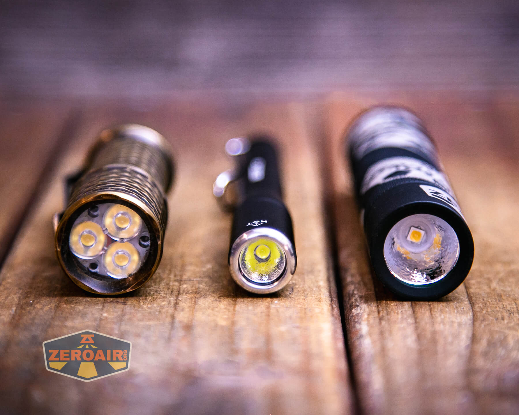 In the photo above, you may note that the SRM (standard reference material) flashlight for comparison has changed! I used a TorchLAB BOSS 35 for ages. Now what you can see as the 18350 SRM is the Hanko Machine Works Trident. While I have not reviewed or tested the Gunner Grip version seen here, I have tested a Hanko Machine Works Trident Total Tesseract in brass. I love the Trident, and it’s a striking contrast next to the inexpensive Convoy S2+, which also makes a great standard reference material.