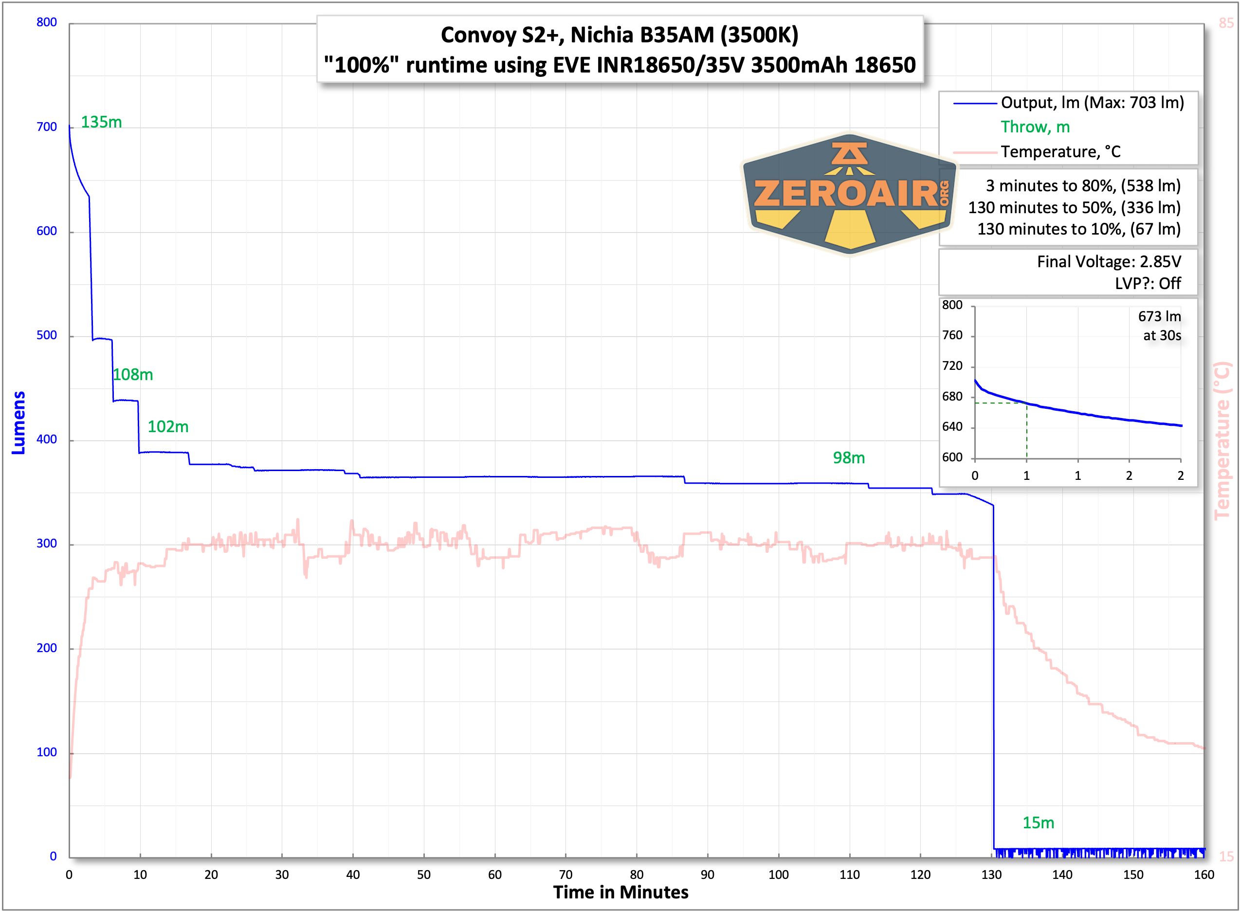 Here are a number of runtimes for the 18650 setup. The light does have low voltage protection. This performance is very typical of the Convoy S2+ 12-mode driver.