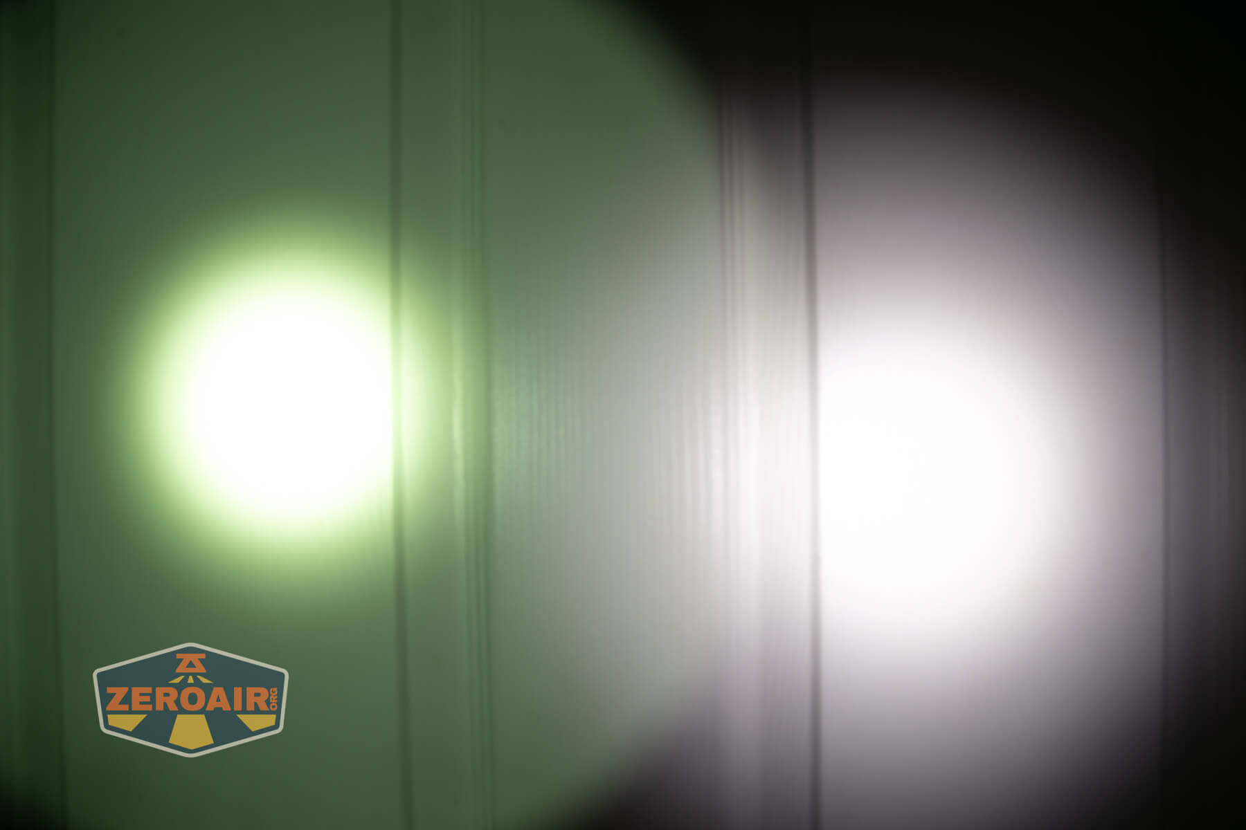 The Cyansky Vanguard flashlight has two e-switches. The left one operates the green laser. It’s just on/off. The right one (with the off-center icon/eyebrow) operates the emitter. These two output (white LED and laser) can be operated independently. That sounds the opposite of how I mean it – you have the laser on at the same time that you have the LED on.