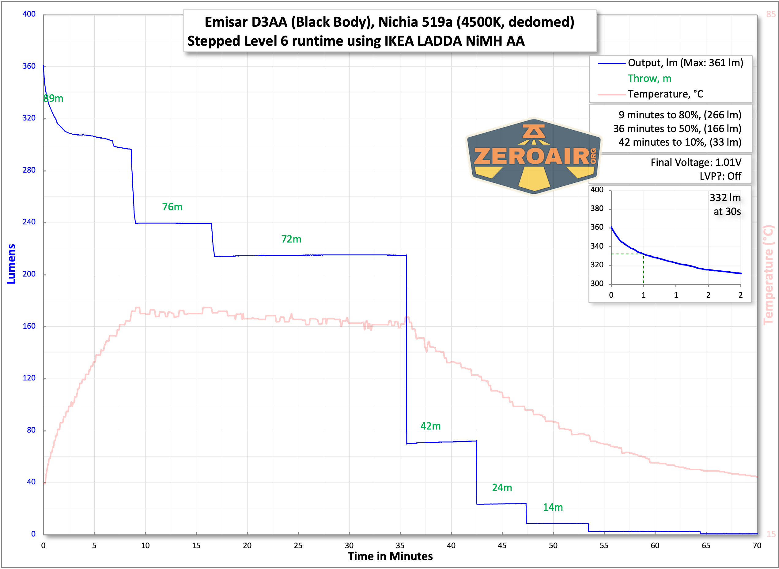 A great feature of the Emisar D3AA 4500K flashlight is that it’ll also run 1.5V cells – primary or rechargeable! I’ve tested a bit with this Ikea LADDA NiMH.