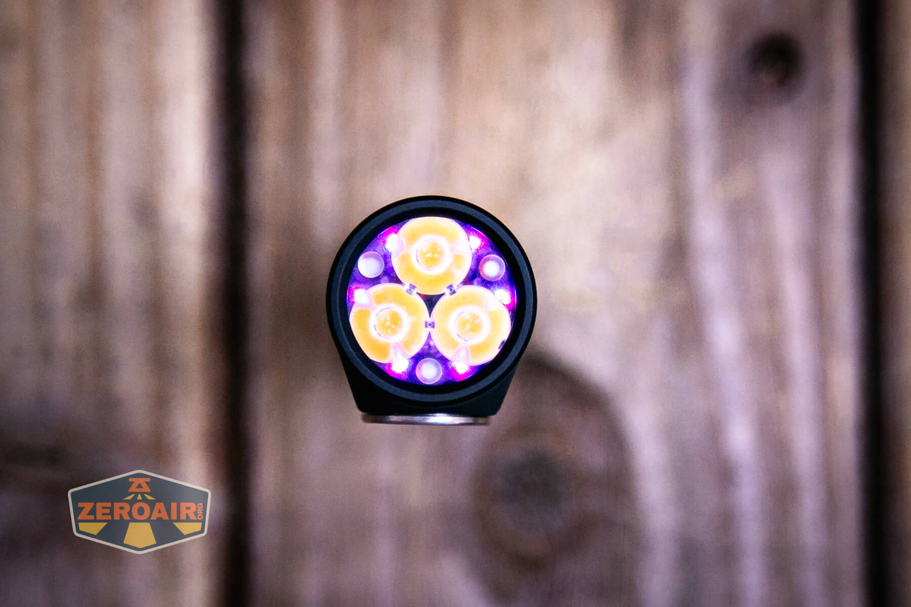 There are three emitters in the Emisar D3AA 4500K flashlight – it’s a triple! These are Nichia 519a 4500K emitters (fantastic) but they’re also dedomed (fantastic) which makes them warmer than the claimed 4500K (fantastic.) I love all the things about this difference!