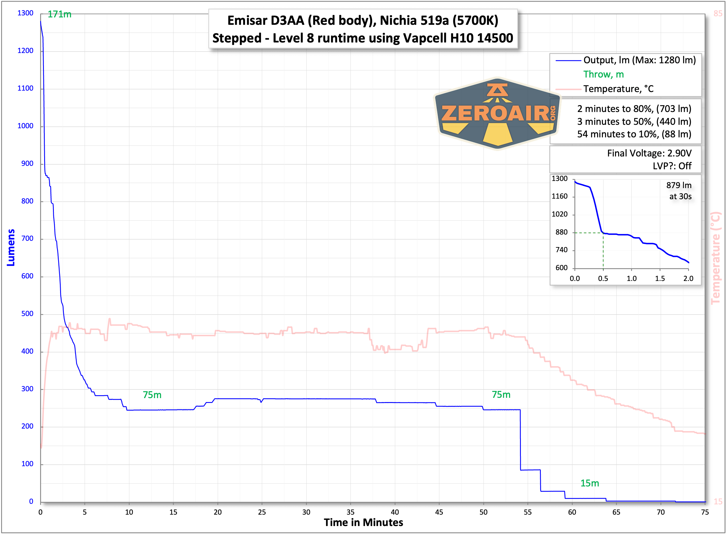 Here are runtimes on the highest four modes with a 14500 cell. I tested with a Vapcell H10. It’s a flat top, but that doesn’t change performance. Initial output is fairly great and very good once the light is around only 300 lumens. I only ever use stepped output, so I know I can reliably get the 400-lumen level – level 6!