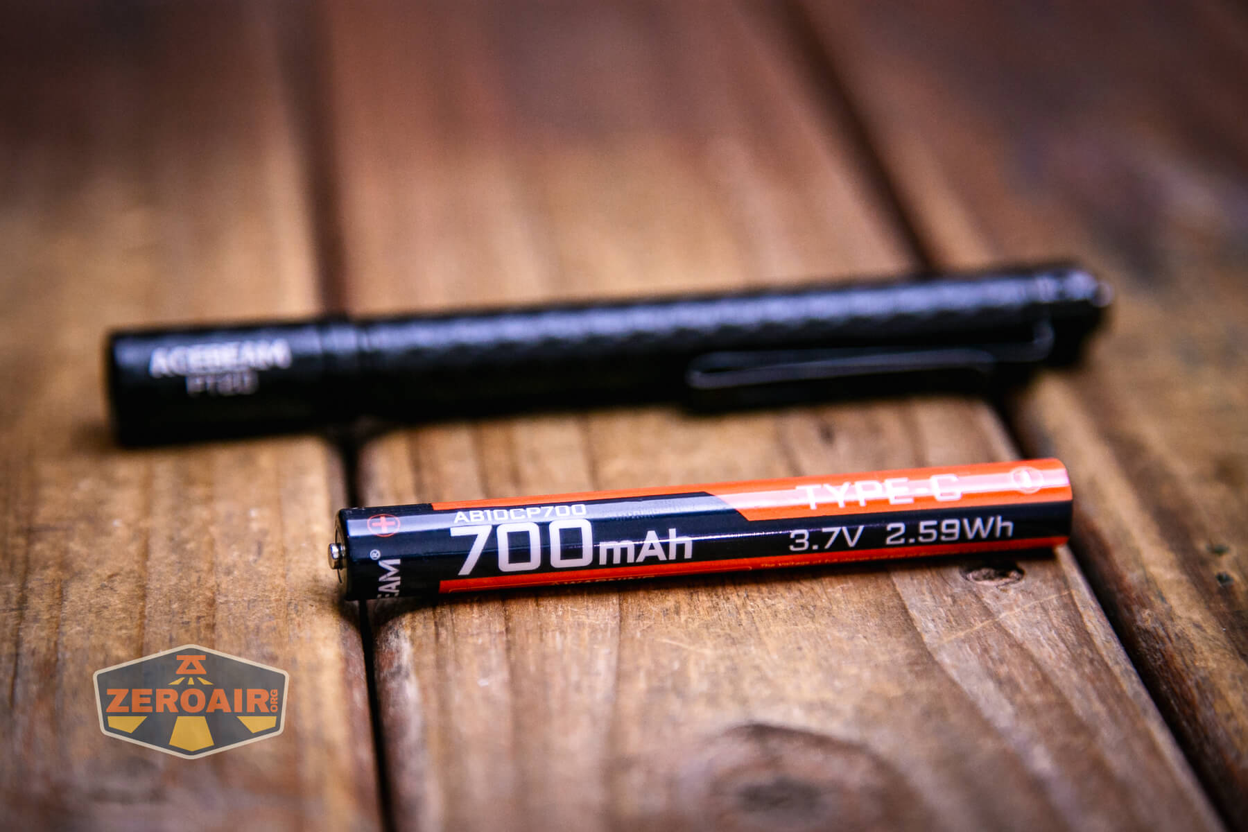 The Acebeam PT20 portable EDC penlight itself does not have built-in charging, but the included 10880 battery does. There’s a USB-C charging port on the positive end.