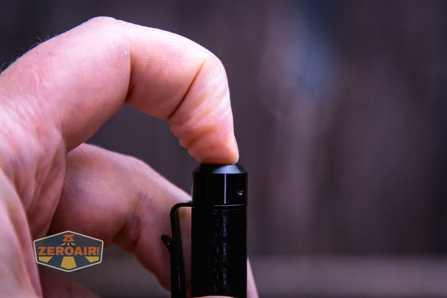 One aspect of the Acebeam PT20 portable EDC penlight that I don’t love is the carbon fiber finish! Yes, I love the look, but do not love it in hand. It’s very slick. Still, it’s possible to use the light one-handed – you can hold it in your hand and still click the button (it’s not that slick).