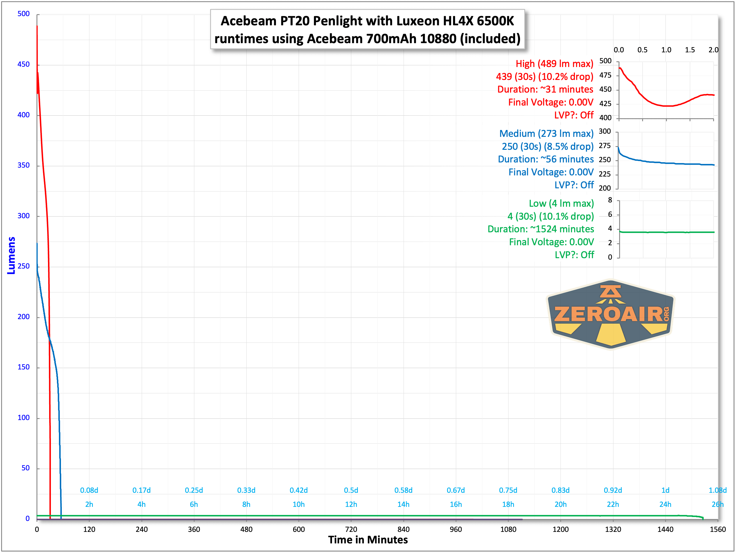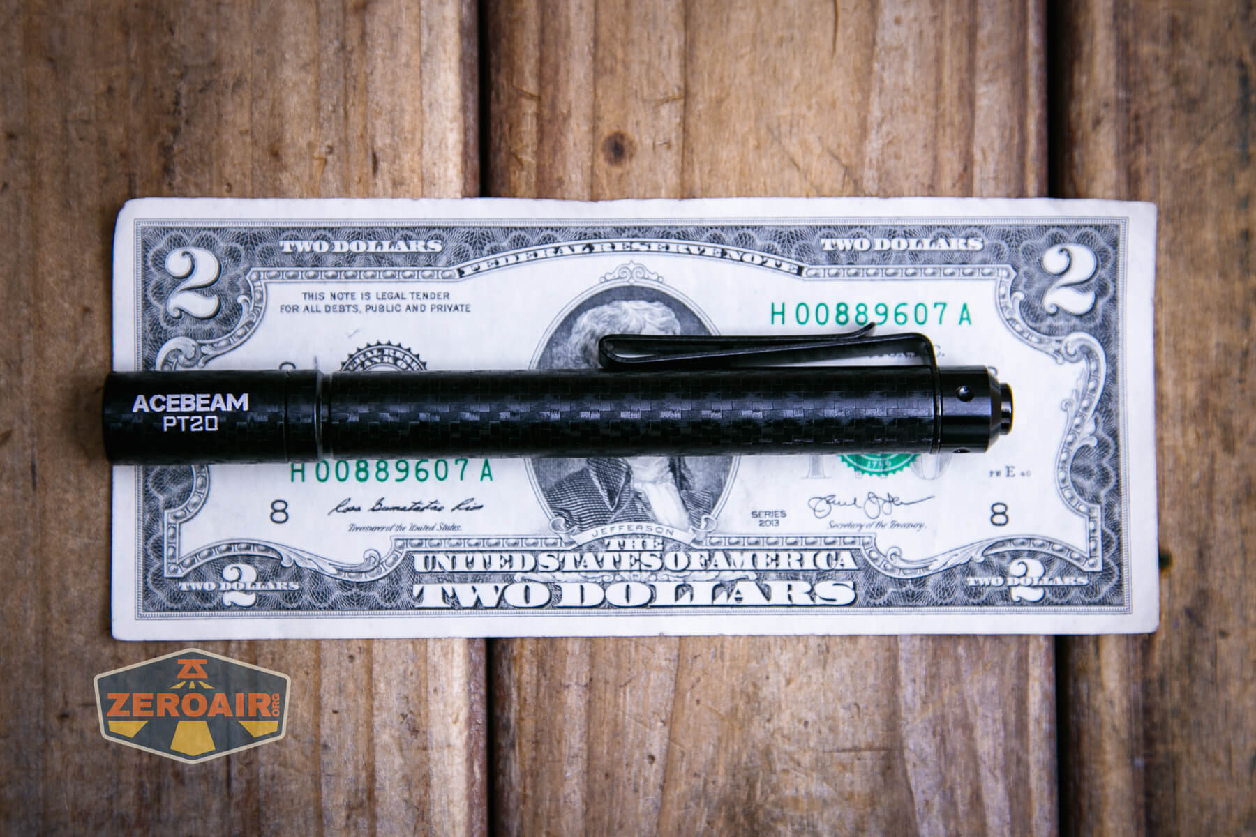 I love the carbon fiber look, but it does make the light a bit slick. Output is fairly good on the highest mode, and has a very long duration on the lowest mode. I very much appreciate that the Acebeam PT20 portable EDC penlight will run 2xAAA cells (primary or rechargeable), but includes a 10880 (which probably provides higher output). This is a reasonable purchase for around $40!