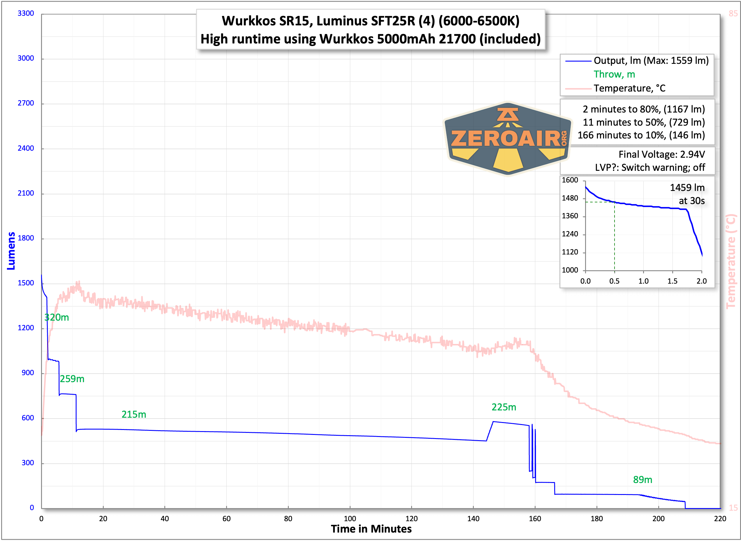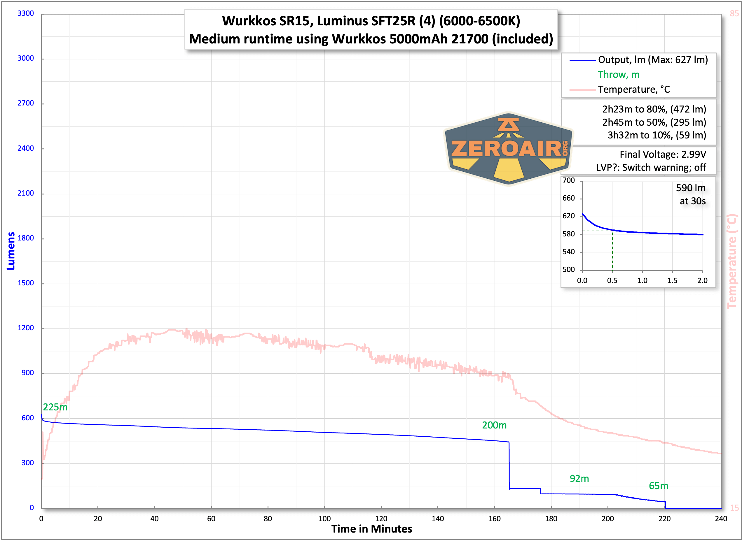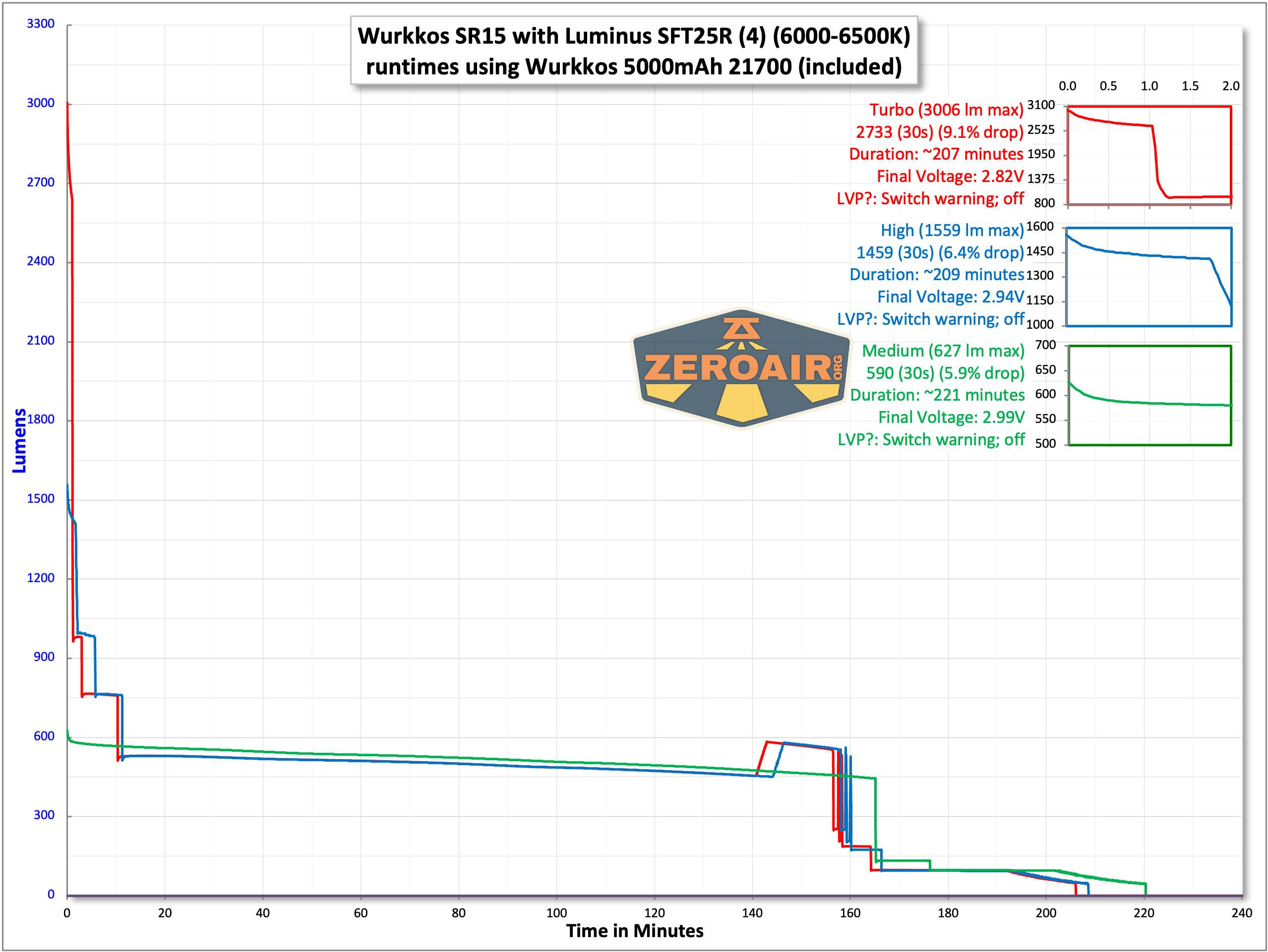 Below are a few runtime tests. The light does not hit the claimed 4500 lumens. After the stepdown, output is steady at around 600 lumens. That’s respectable and also will provide a good bit of throw due to the beam profile.
