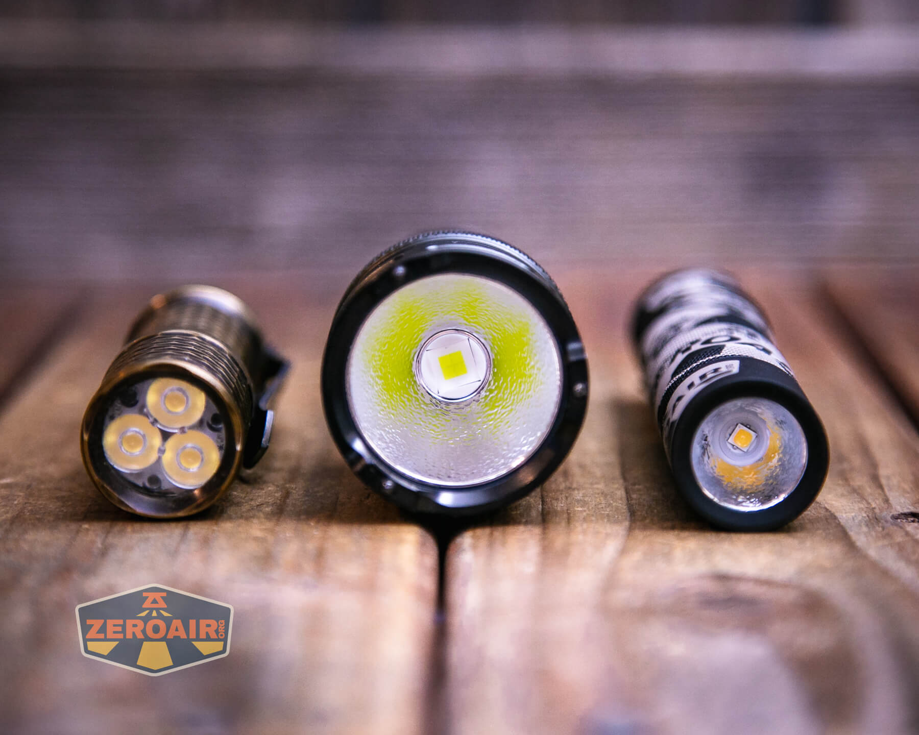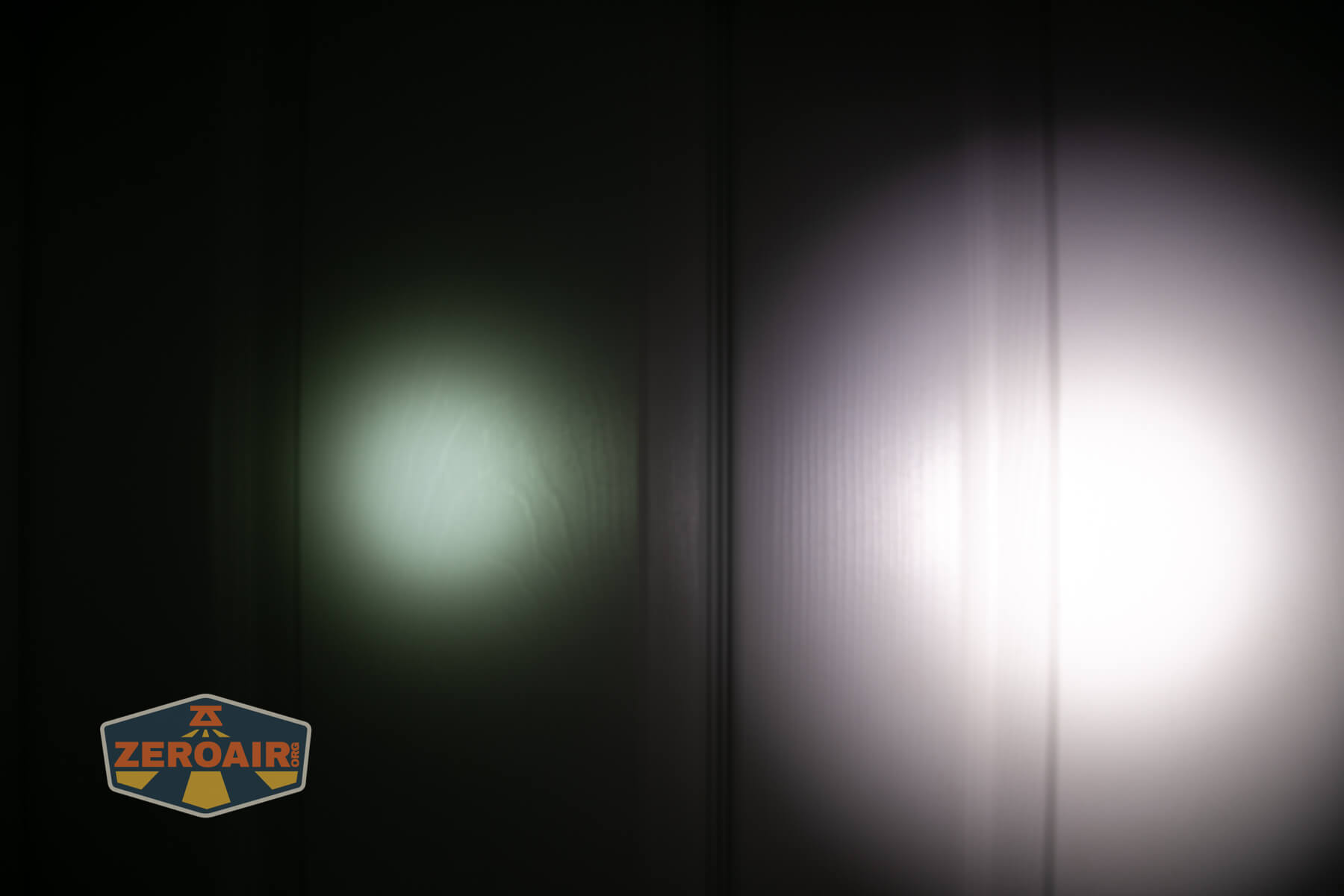 In the photo above, you may note that the SRM (standard reference material) flashlight for comparison has changed! I used a TorchLAB BOSS 35 for ages. Now, what you can see as the 18350 SRM is the Hanko Machine Works Trident. While I have not reviewed or tested the Gunner Grip version seen here, I have tested a Hanko Machine Works Trident Total Tesseract in brass. I love the Trident, and it’s a striking contrast next to the inexpensive Convoy S2+, which also makes a great standard reference material.