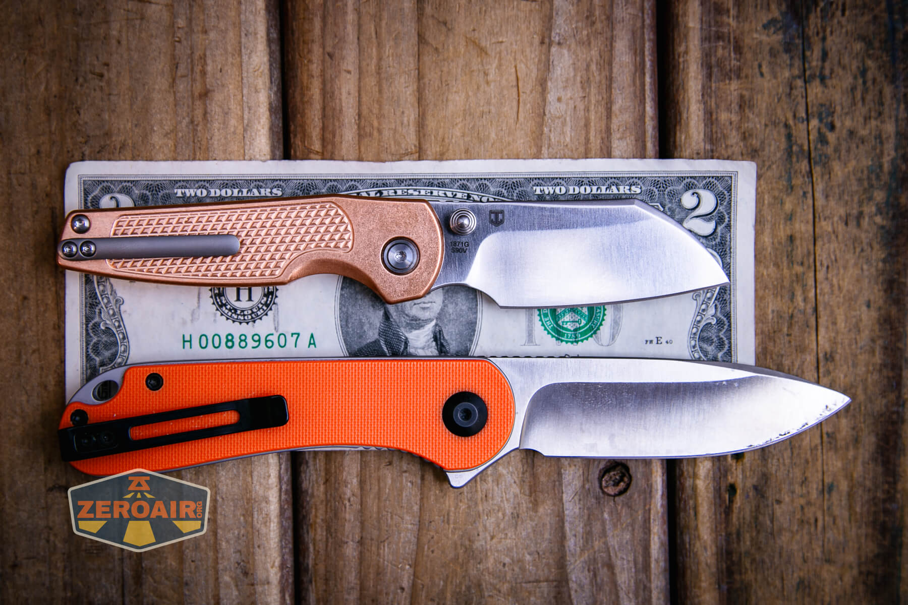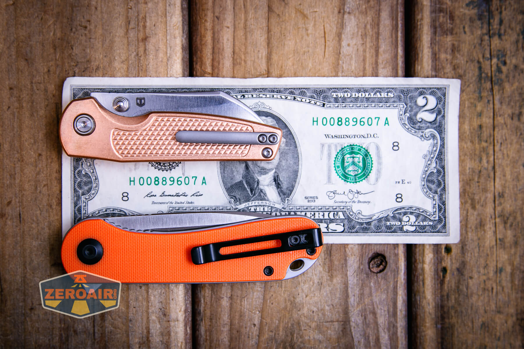 Above, you can see the Artisan Cutlery Cleo knife with the Civivi Elementum in orange G10. I use that knife so much!