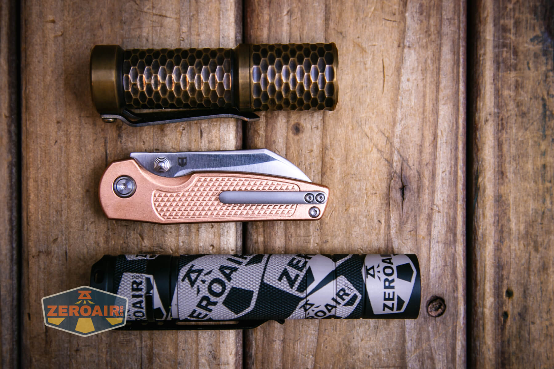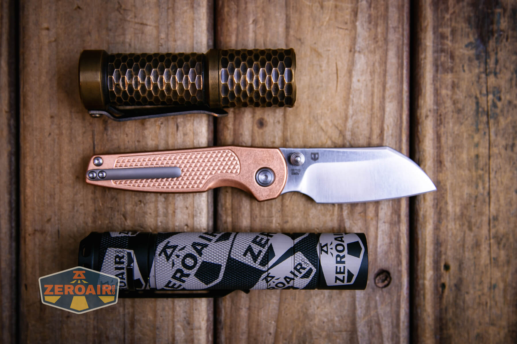 Below, you can see the Artisan Cutlery Cleo knife with the venerable Convoy S2+. The version below is a custom laser-engraved Convoy S2+ host by GadgetConnections.com. I did a full post on an engraved orange host right here! Or go straight to GadgetConnections.com to buy your Convoy S2+ now!