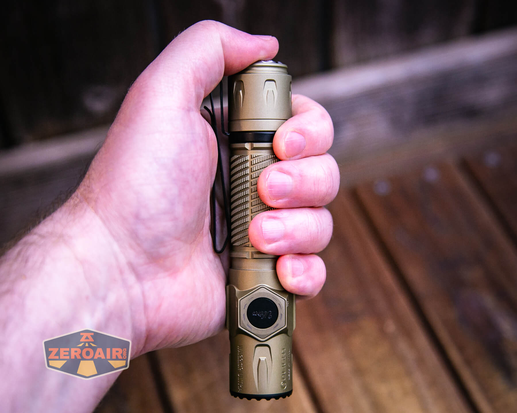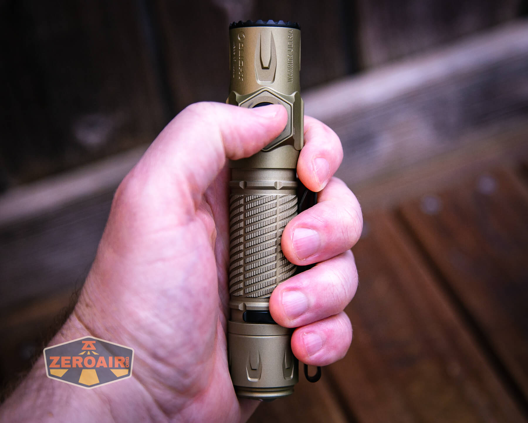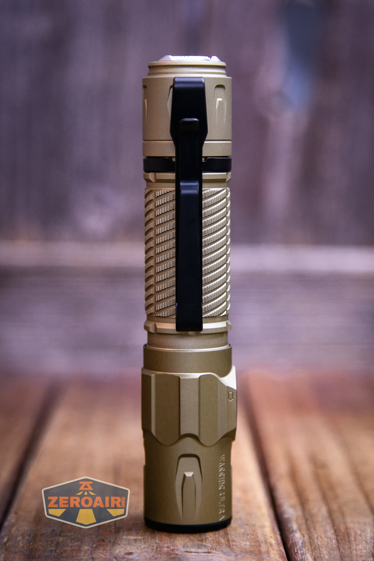 This is the Ultra version of the Olight Warrior. There have been many Warriors, including the Olight Warrior 3S (in Dream Blue) seen here not too long ago. Physically, the lights are very similar! The Olight Warrior Ultra flashlight body has a more grippy spiral design, and the switch area has been updated. But the appointments are basically the same otherwise.
