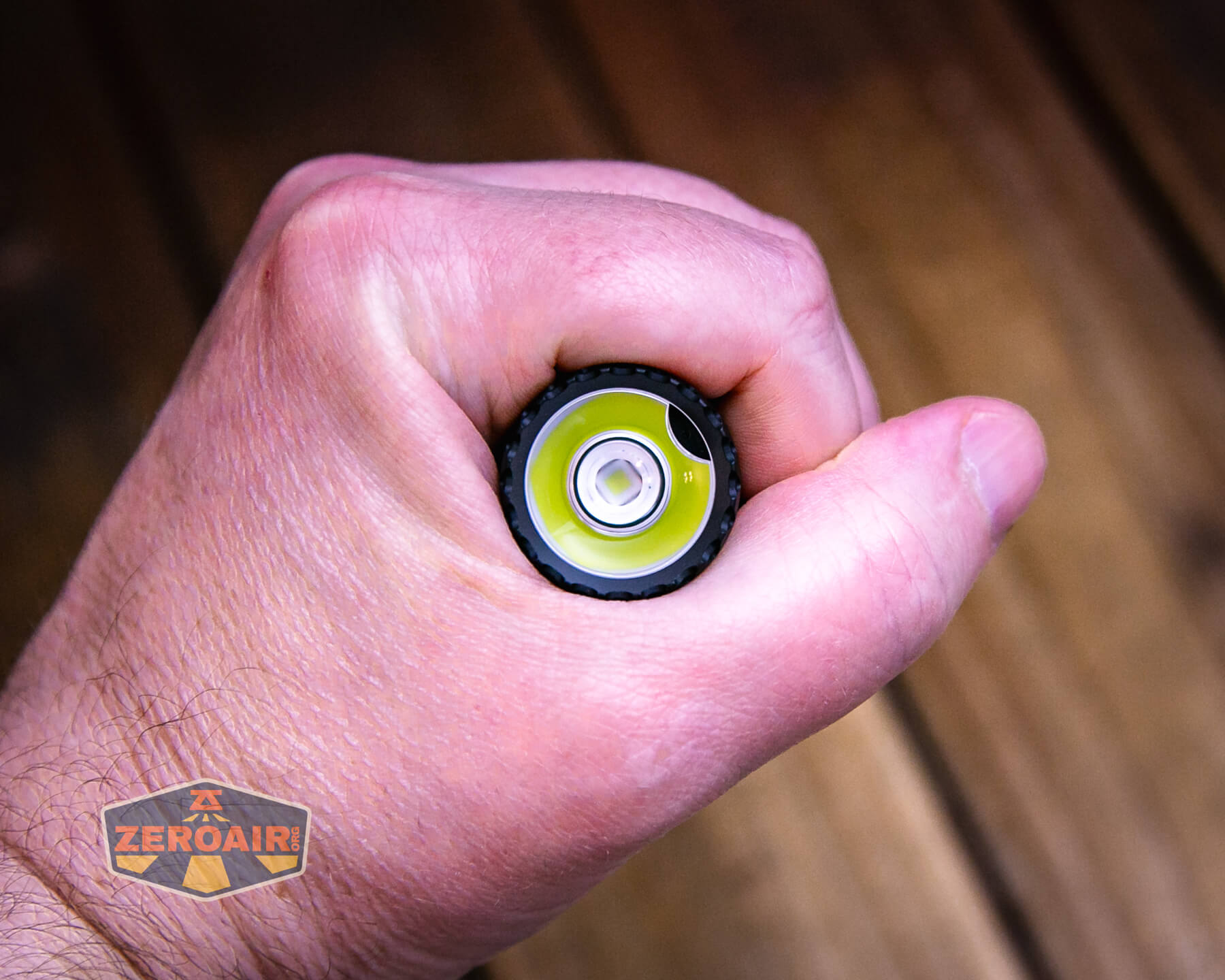 We still have the fairly standard tailcap setup here from Olight. The threads are so smooth, too. Just over 6 full turns are required for tightening the tailcap – quite long threads. One notable change here is that the threads are not anodized!