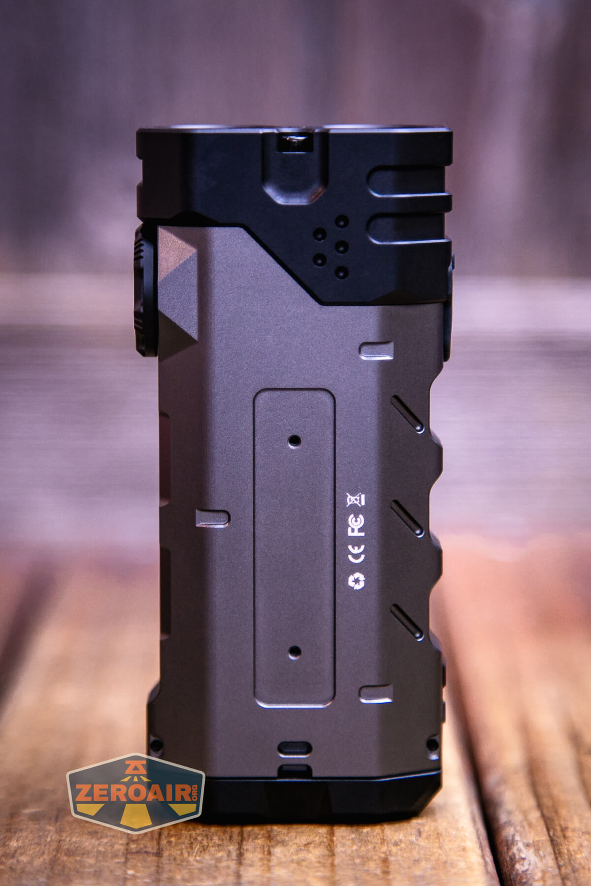 The LoopGear SK-05 Pro flashlight is capable of being used as a powerbank. Below you can see the side markings – the light can be charged at 5, 9, or 12V, and can also output (powerbank) at 5, 9, and 12V.