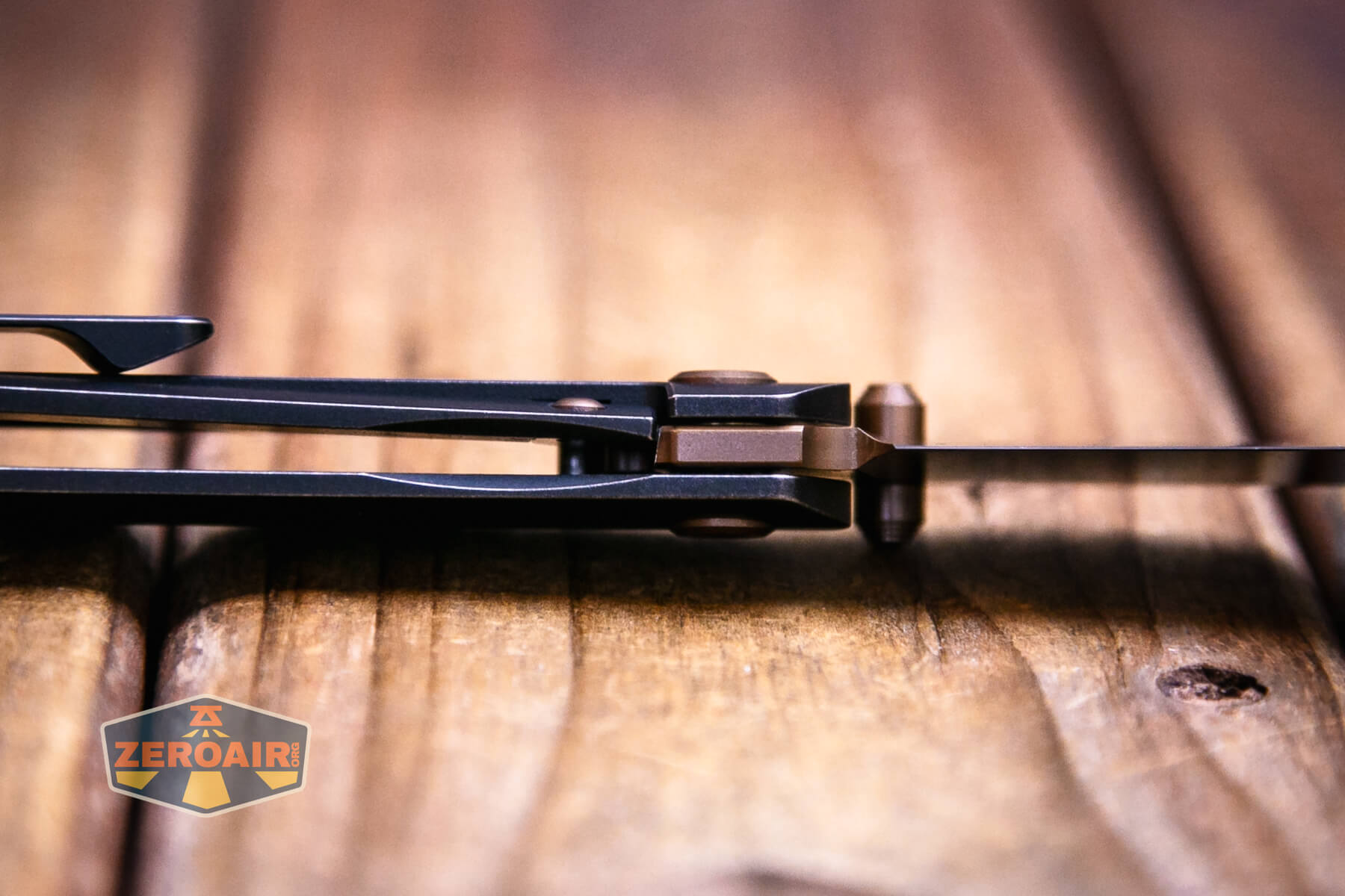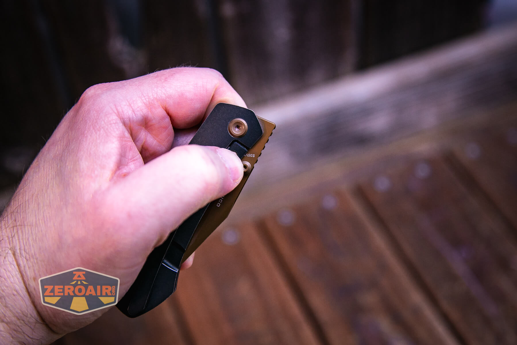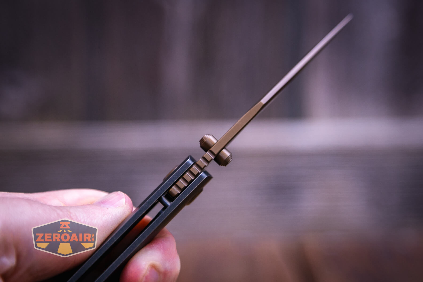 Bearings here are caged ceramic ball bearings. The knife has a fantastically smooth action. It really says something about the knife that I’m able to use the thumb flick action for opening it. That means it’s smooth!