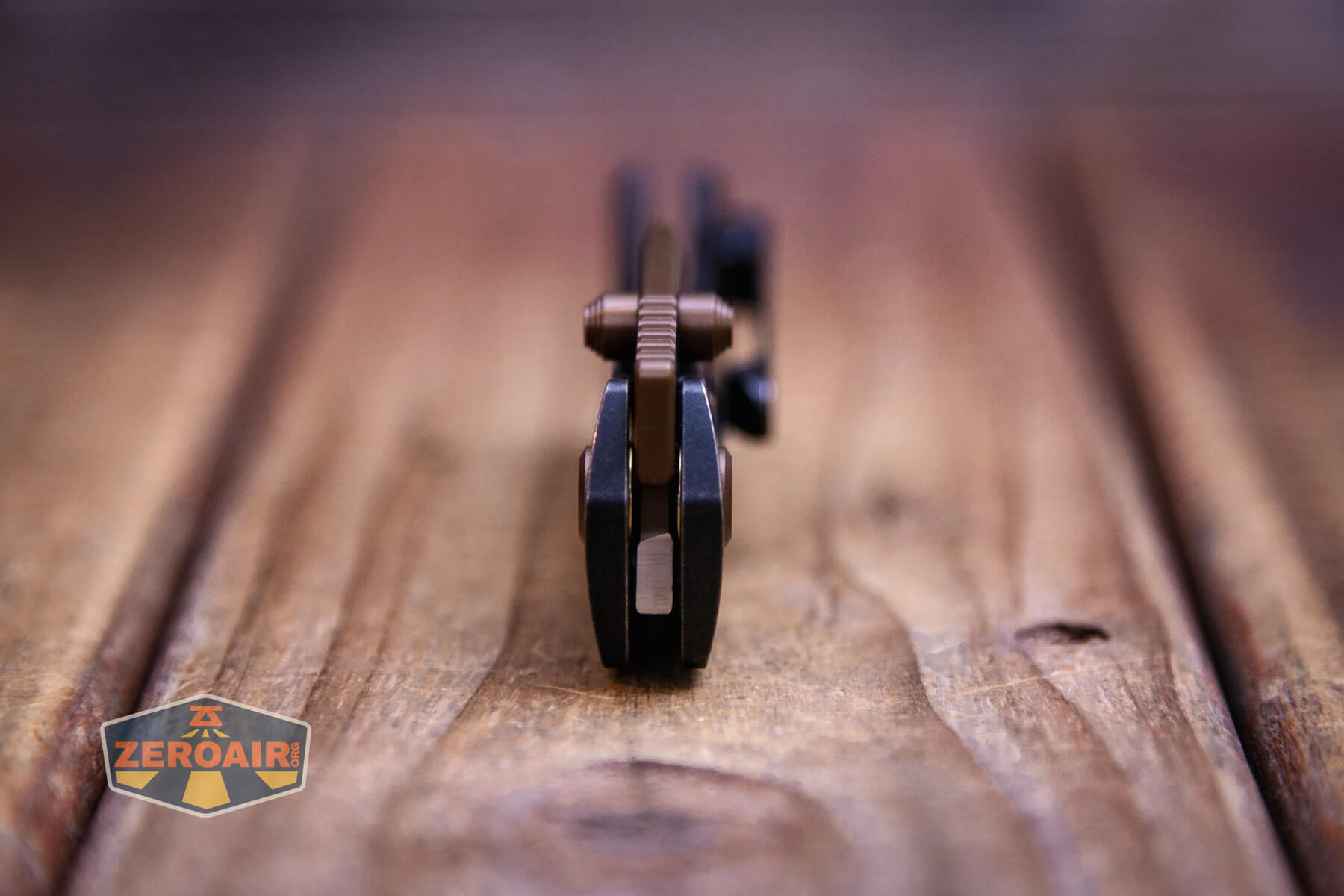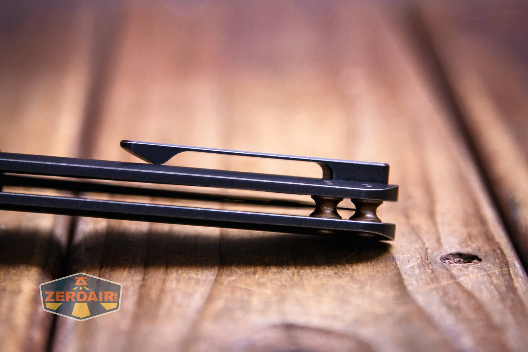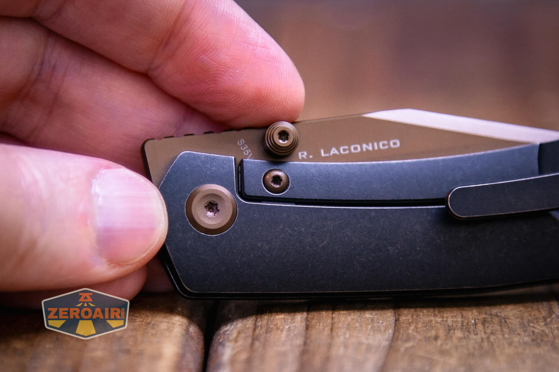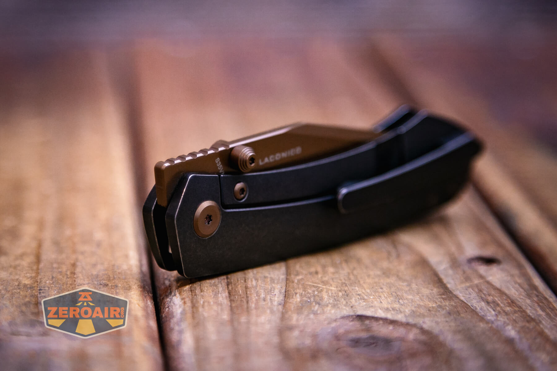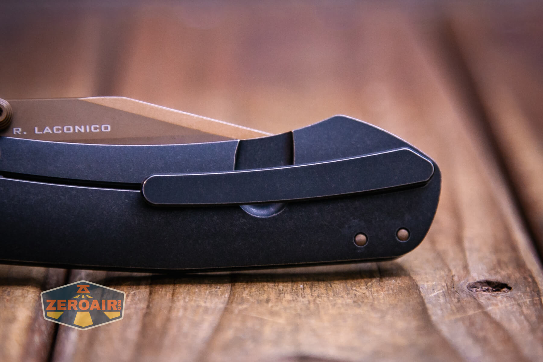 Again, the clip is not reversible to the other side or the other end. Where it is as seen in these photos is the only place it can go. I suppose you could remove it completely, but you’d need to disassemble the knife to do so. The clip is held in place with two screws, which are visible if you look just right inside (not below, those are the backspacer screws!)