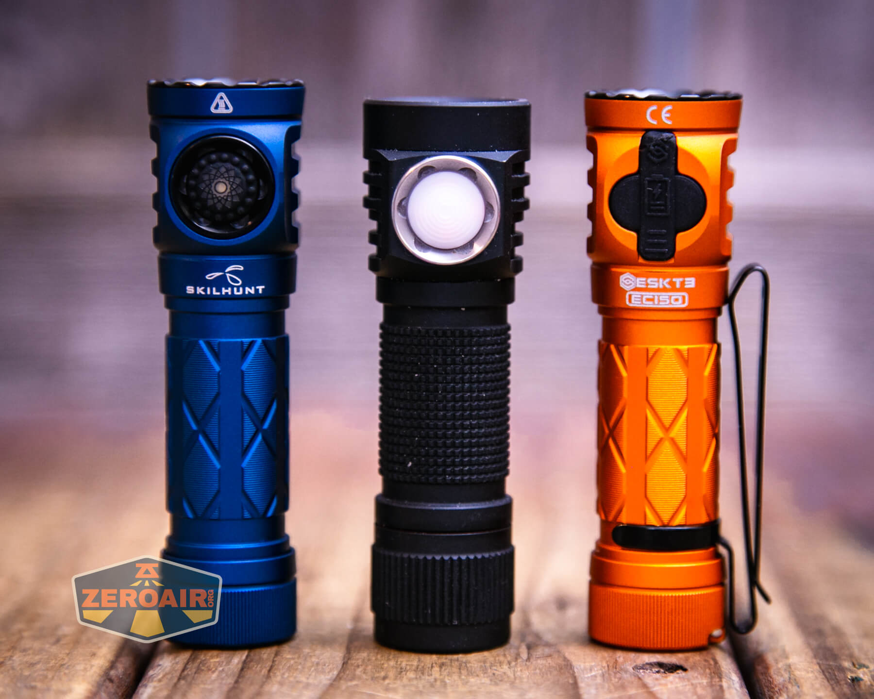 Below you can see the Skilhunt EC150 Nichia 519a flashlight compared to what’s probably its nearest competitor, the Emisar D3AA. By most accounts, these are very similar lights! The Skilhunt has USB-C charging but lacks secondary emitters. I find the Skilhunt to have a much higher build quality. The blue light below is the Luminus SFT25R version of the EC150, which I have also reviewed.