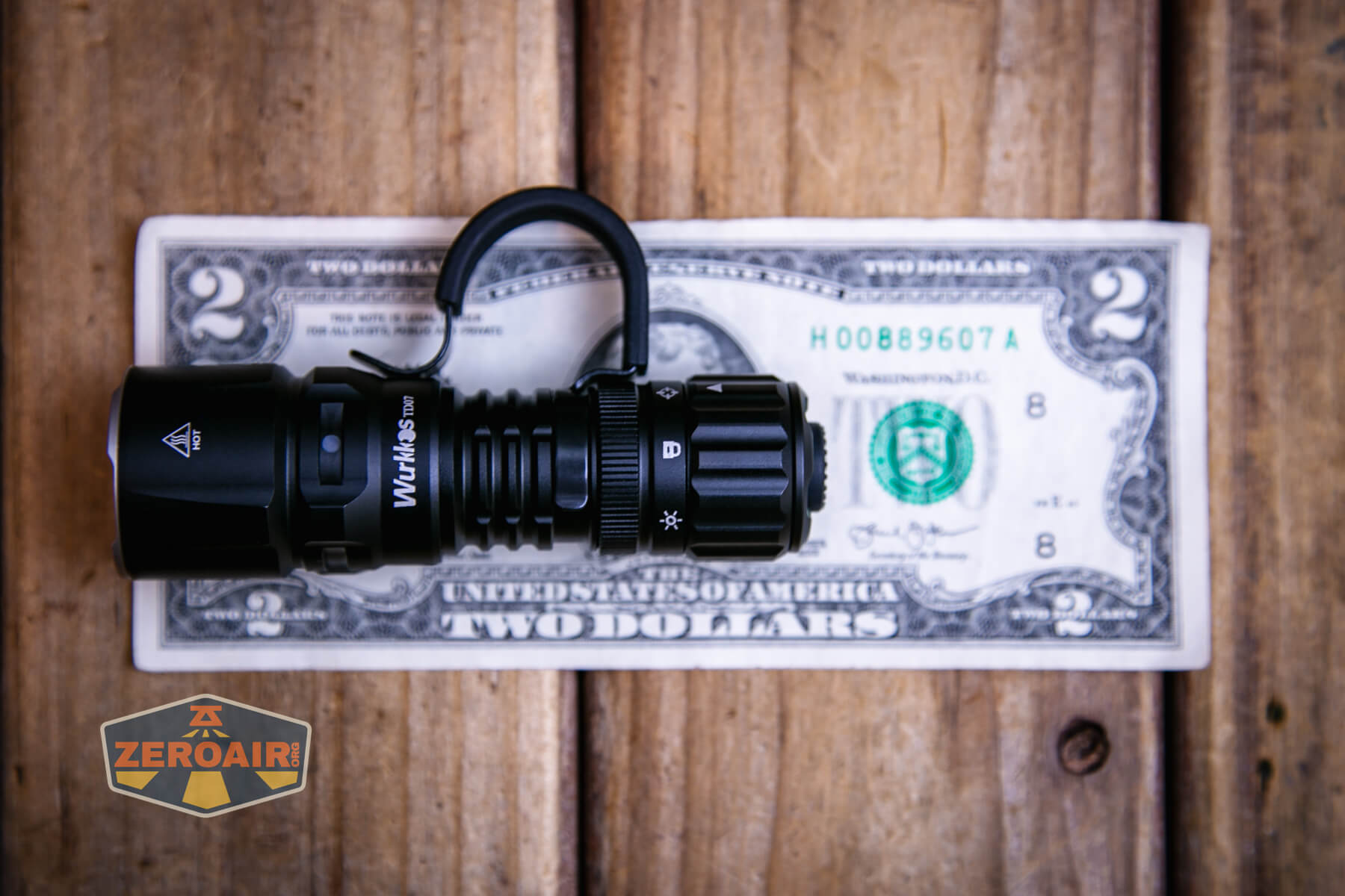 A black Wurkkos TS22 flashlight with a metal clip is lying on a wooden surface, next to a Wurkkos TD07 tactical flashlight. The ZeroAir logo appears in the lower left corner of the image.