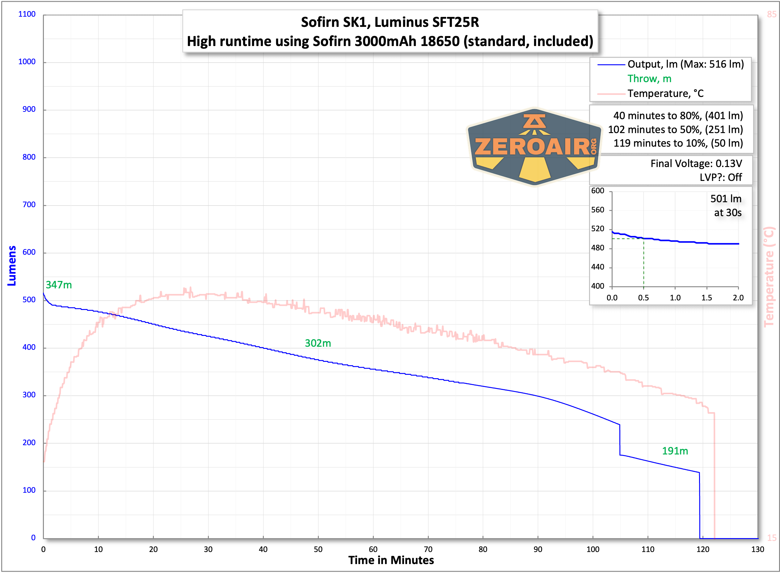 | Measured Lumens (at 30s) | 1050 (80.8% of claim)^ |