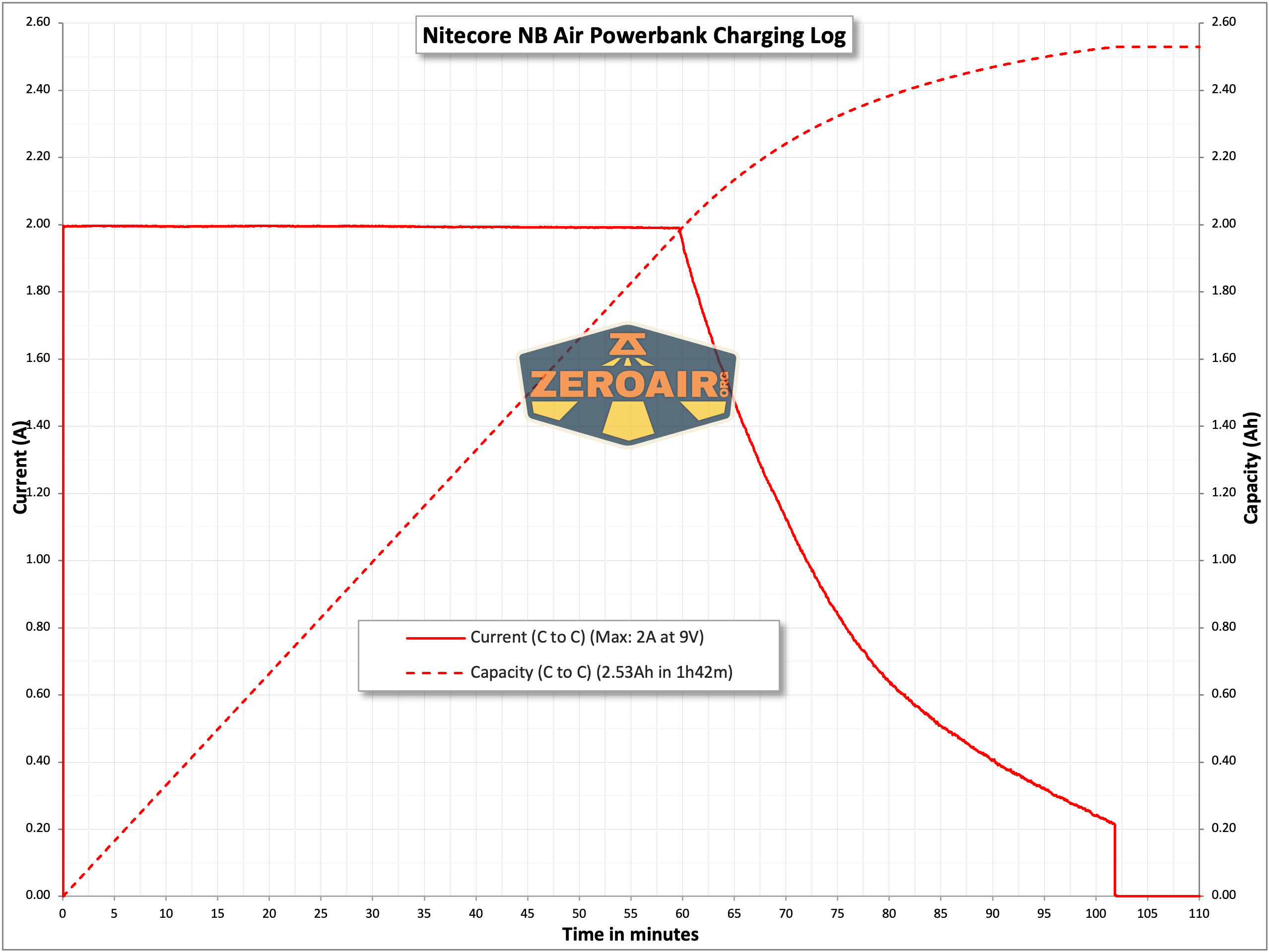 When 9V is available, the Nitecore NB Air power bank will charge at 9V and requires just 1h42 minutes to complete. That’s great!