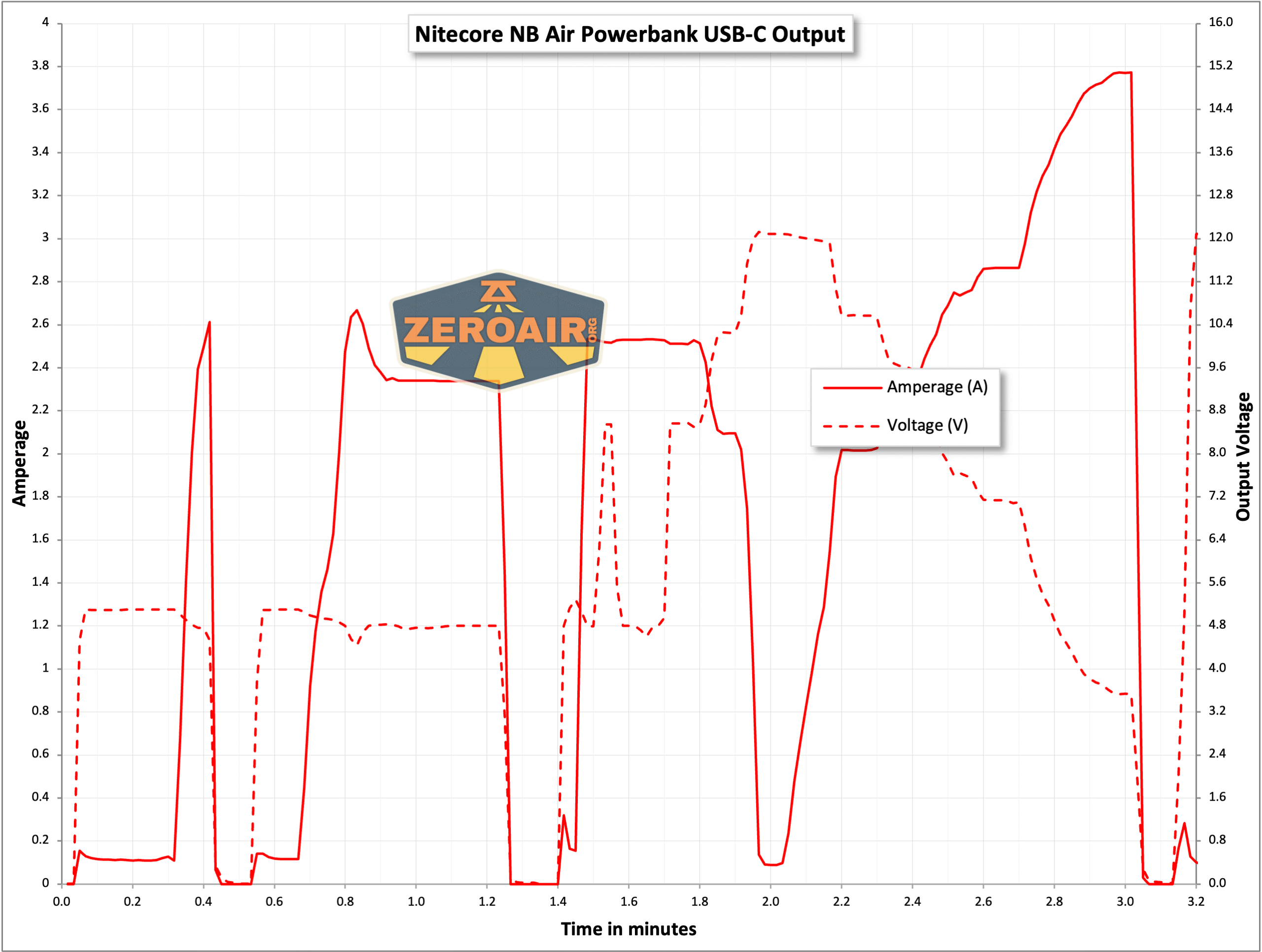 Below you can see one test of the Nitecore NB Air power bank. Two graphs of the same data, but the first describes a bit of stress testing for output and voltage options, etc. Everything is automatic, so if a device is capable and requests it, the Nitecore NB Air power bank will output 5, 9, or 12V – this is all 18W maximum.