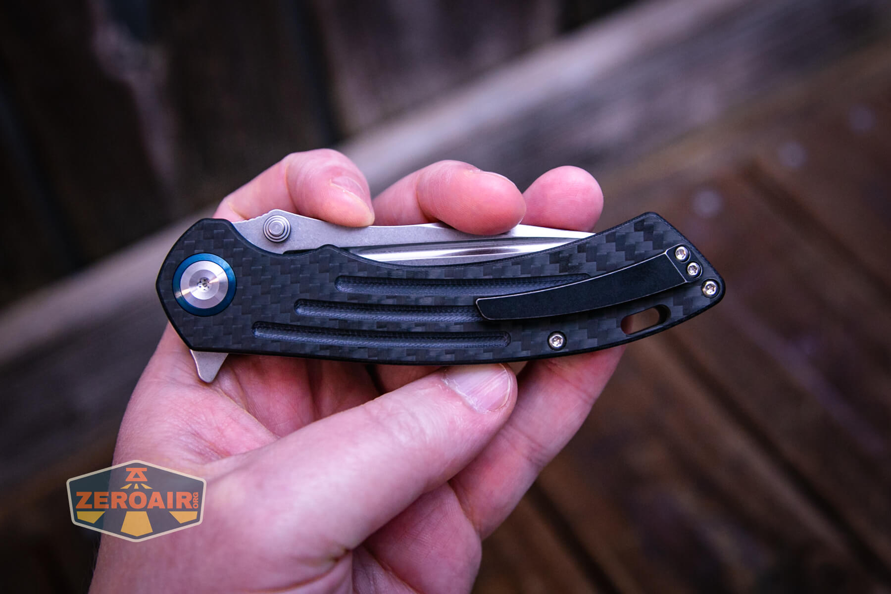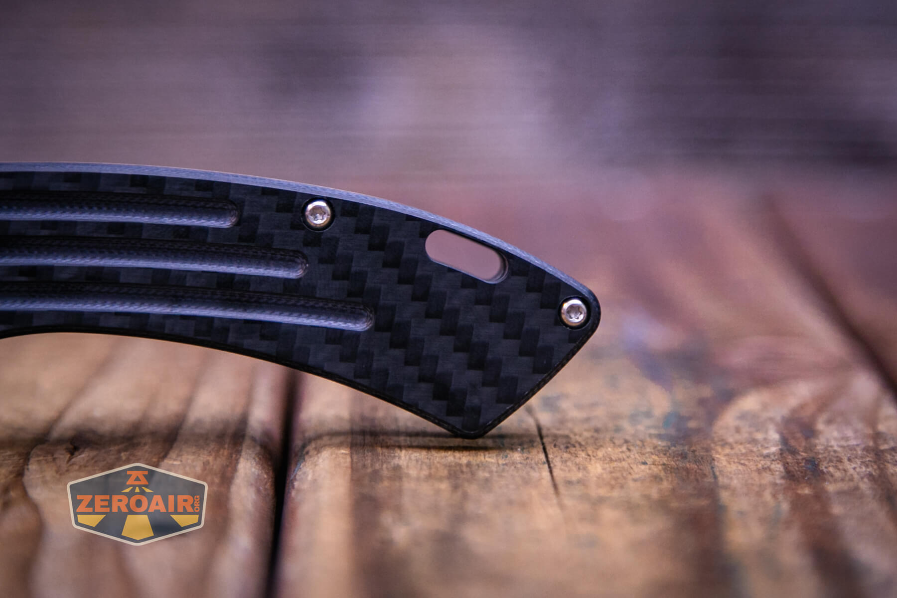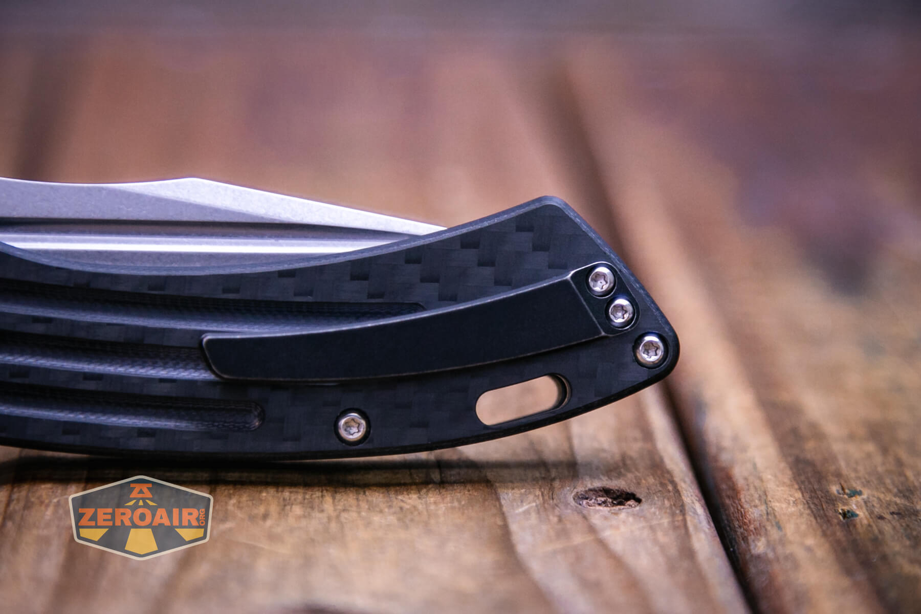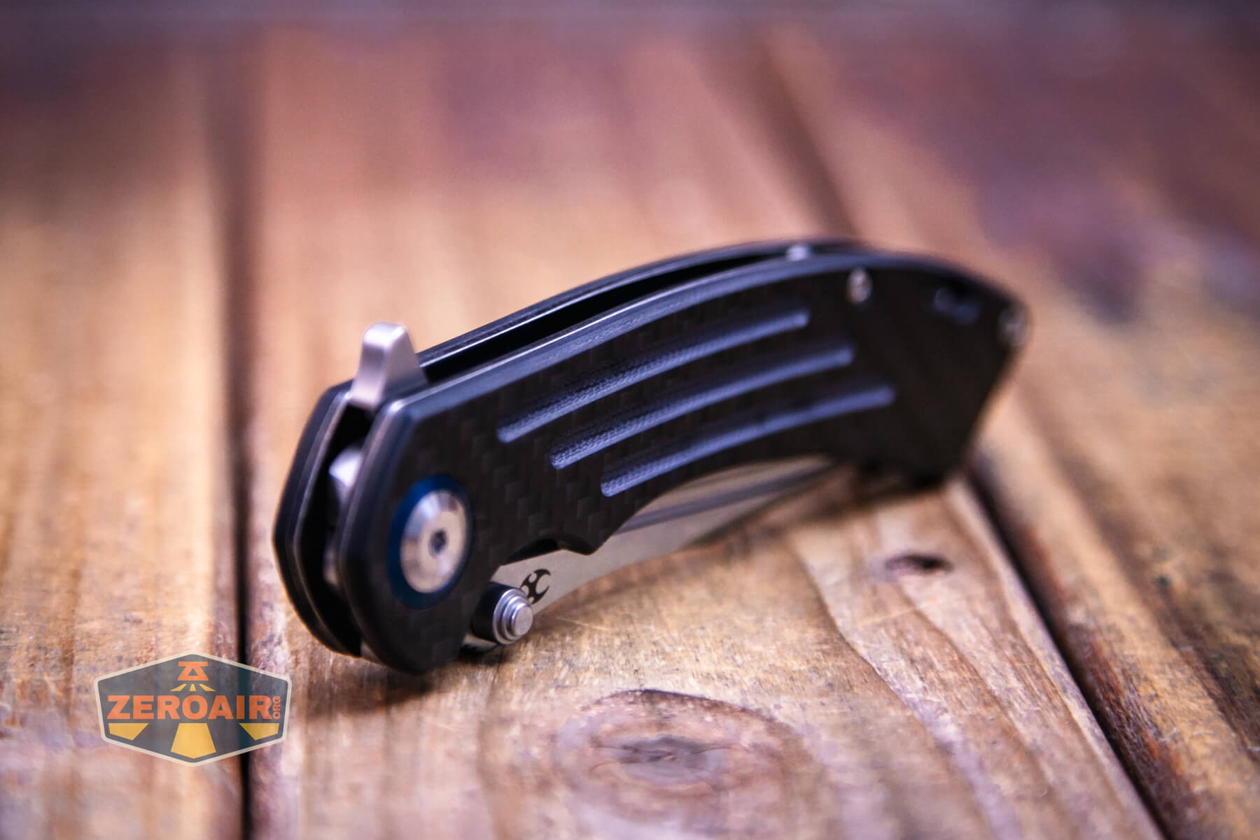 I’m a big fan of carbon fiber, and on the Kansept Pretatout flipper knife, there’s a good bit of carbon fiber! It’s neat, too, as it has grooves for both grip and to further show off the carbon fiber detail.