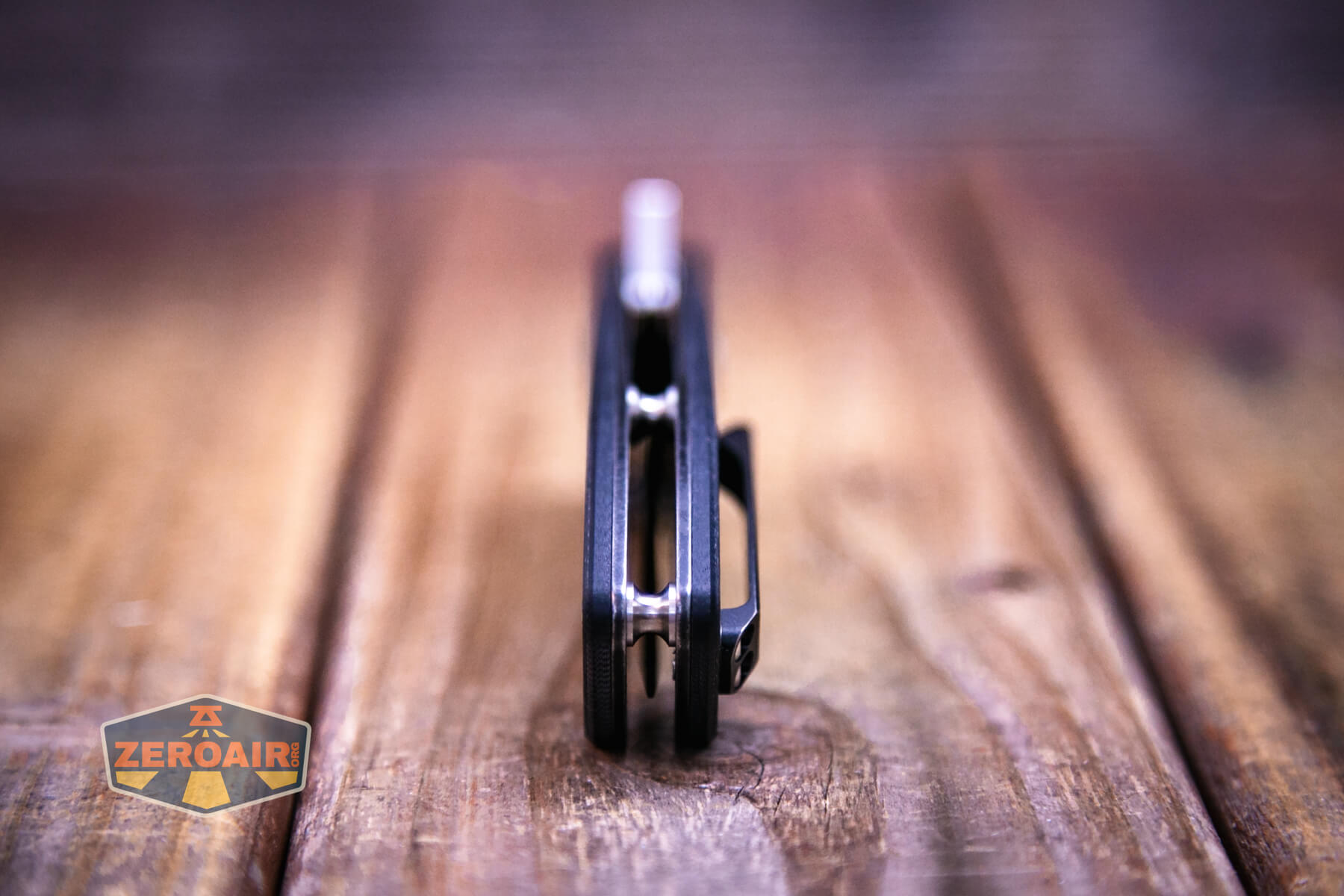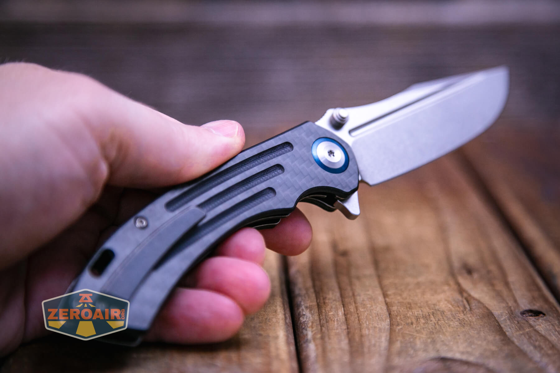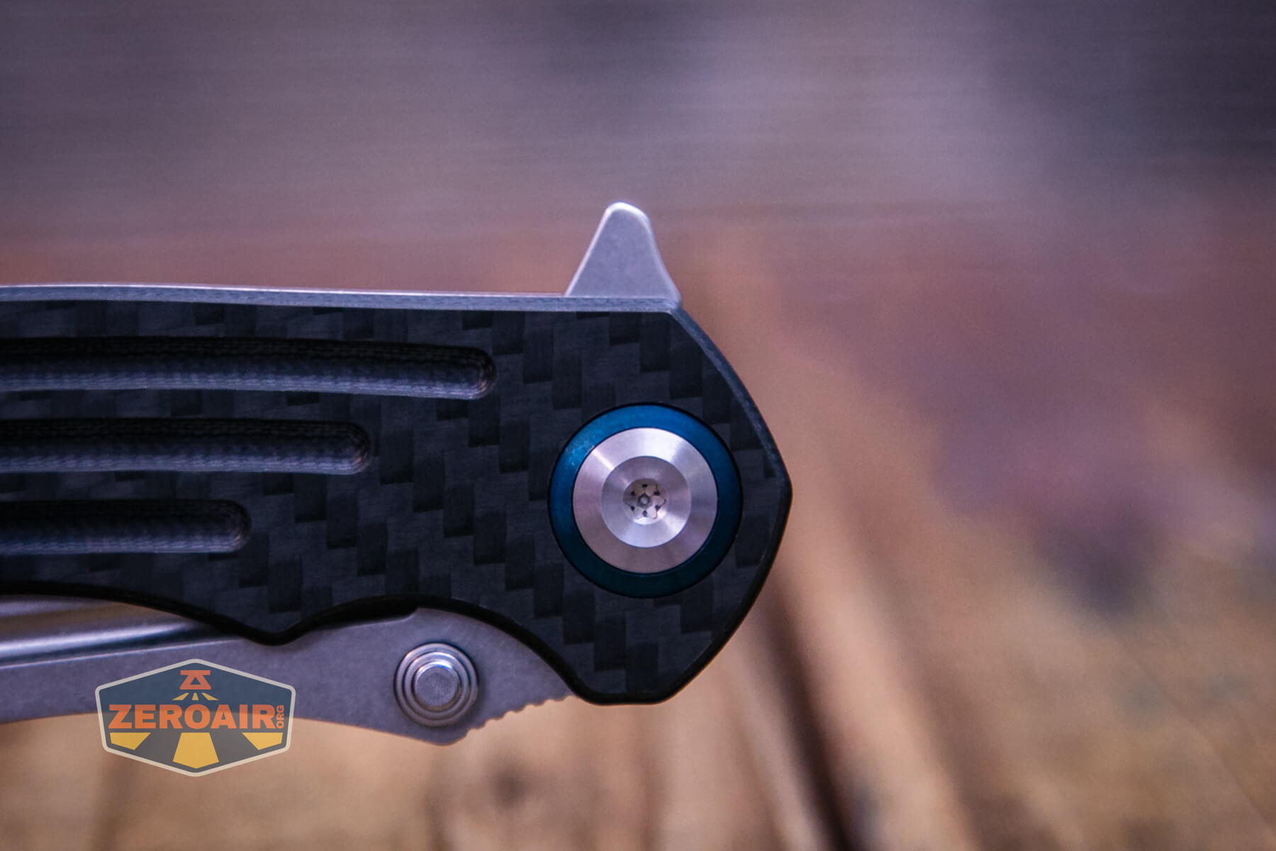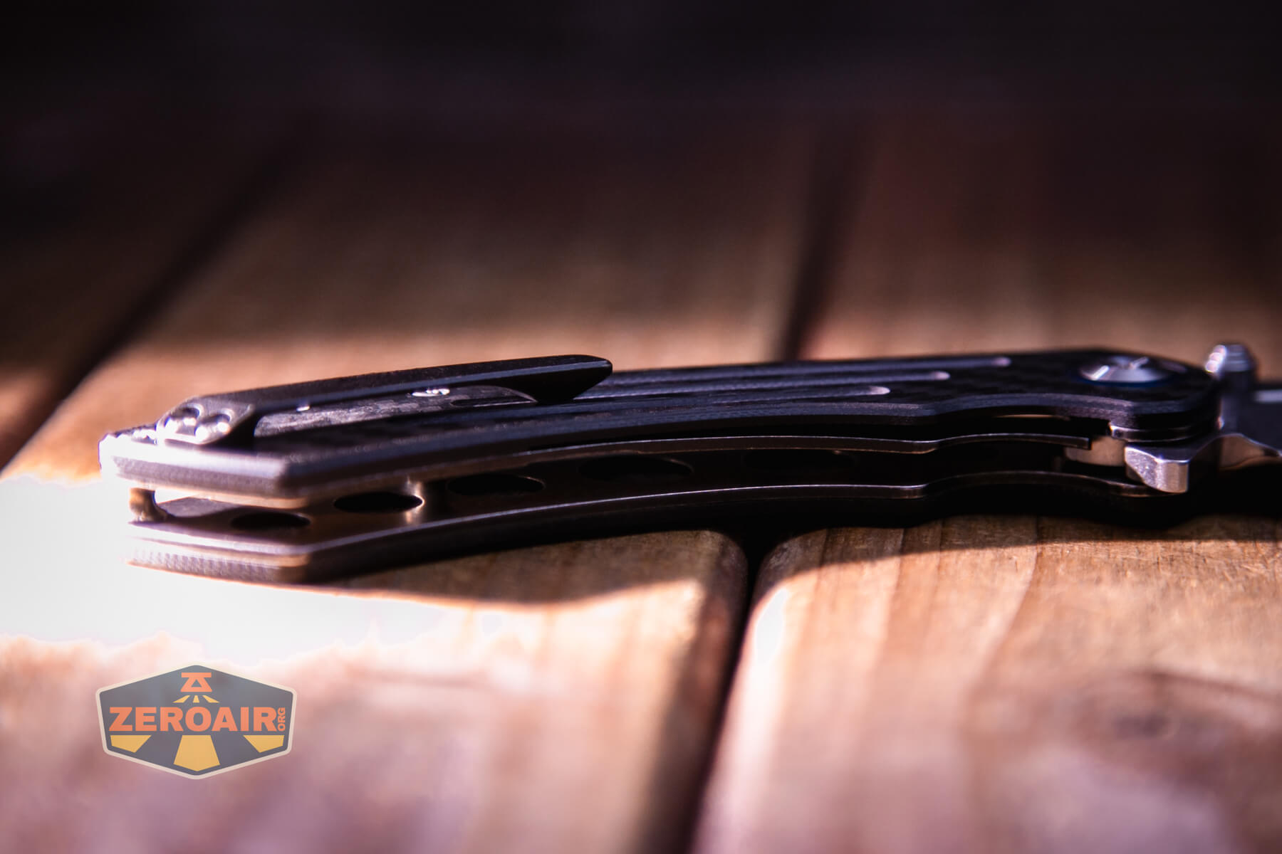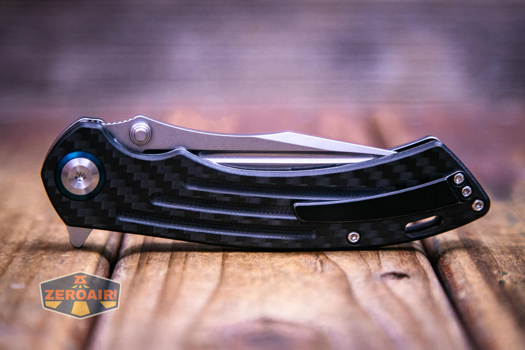 I’m a big fan of carbon fiber, and on the Kansept Pretatout flipper knife, there’s a good bit of carbon fiber! It’s neat, too, as it has grooves for both grip and to further show off the carbon fiber detail.