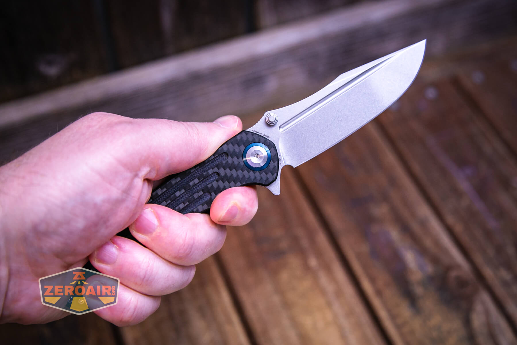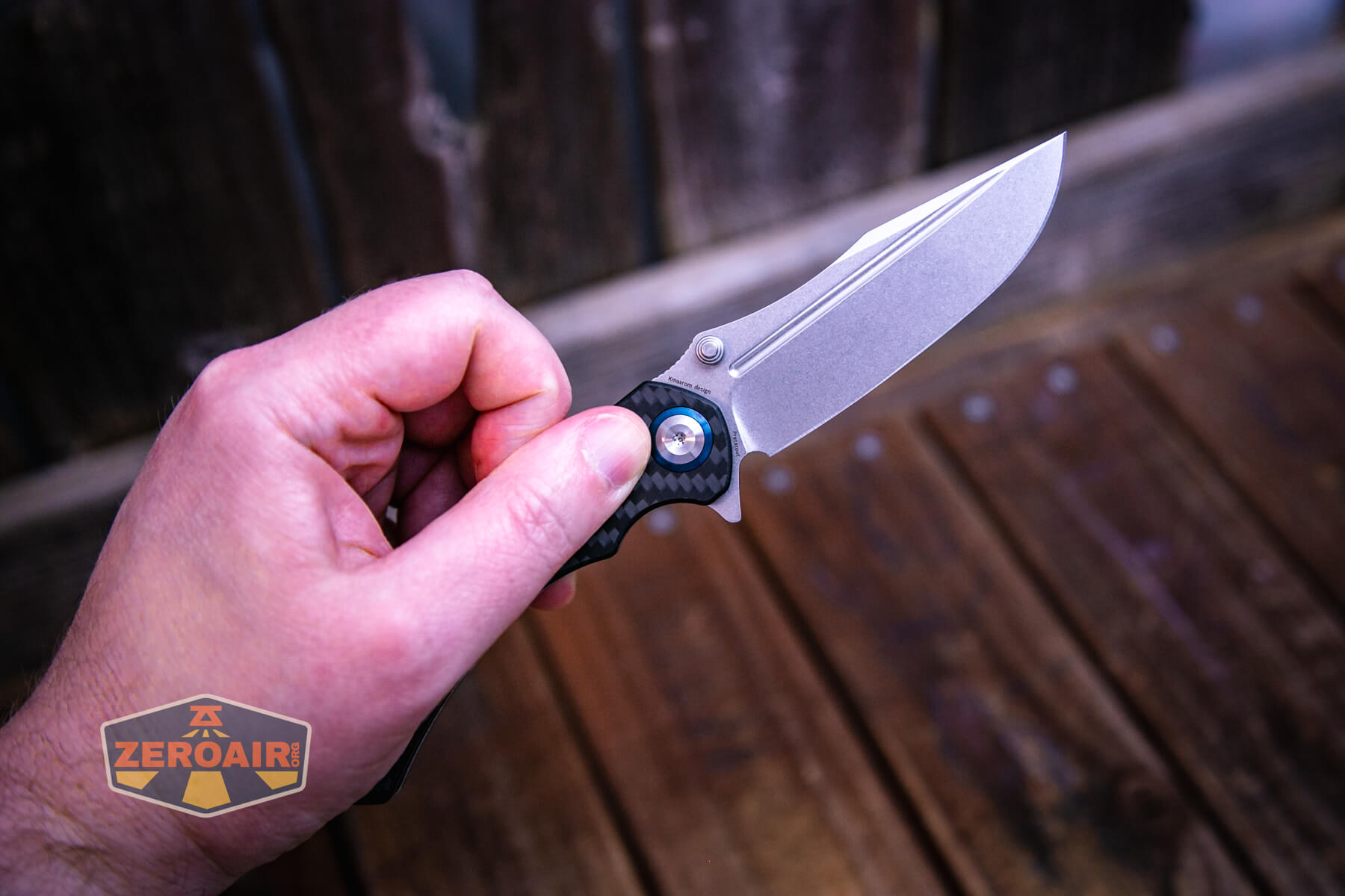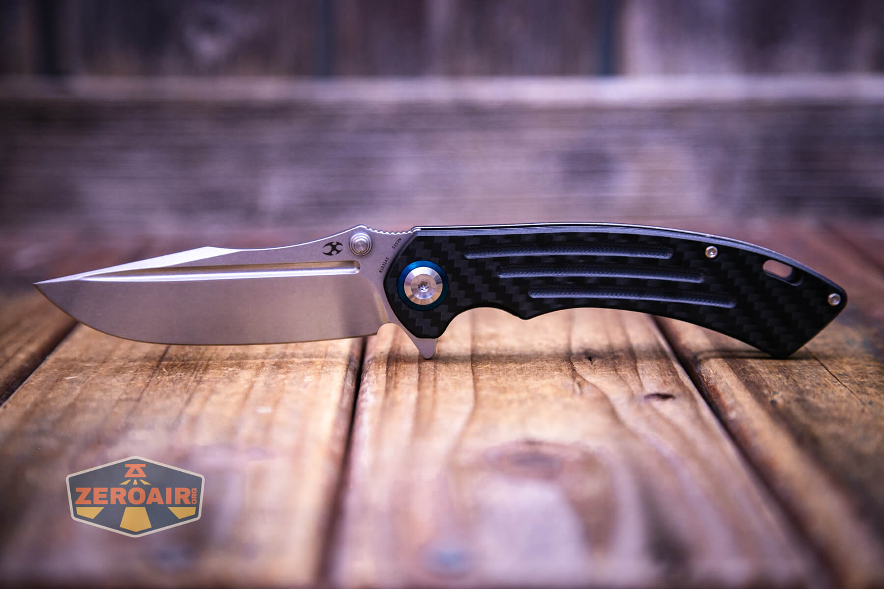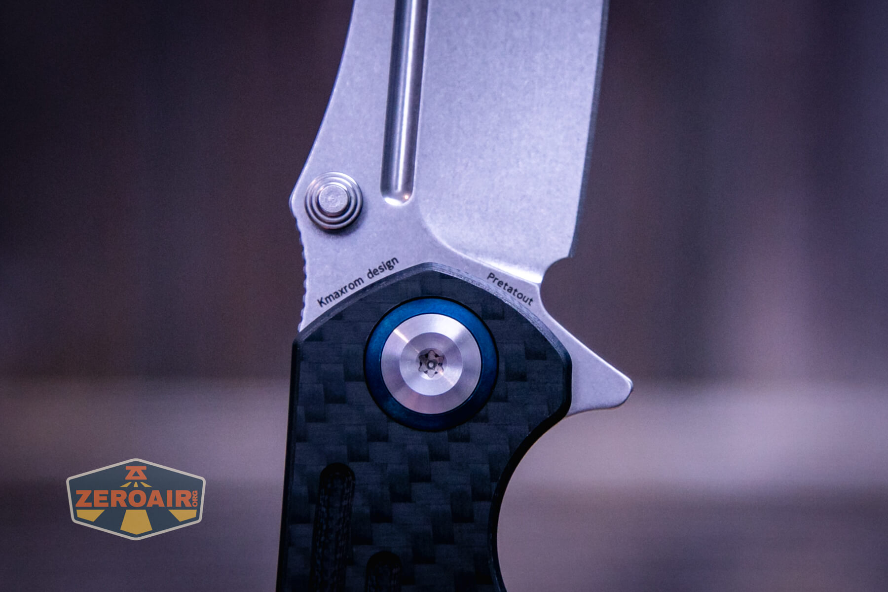 The Kansept Pretatout flipper knife by Jonathan of Kmaxrom Design features a carbon fiber handle and a stonewashed drop point blade. And it’s a flipper! Read on!