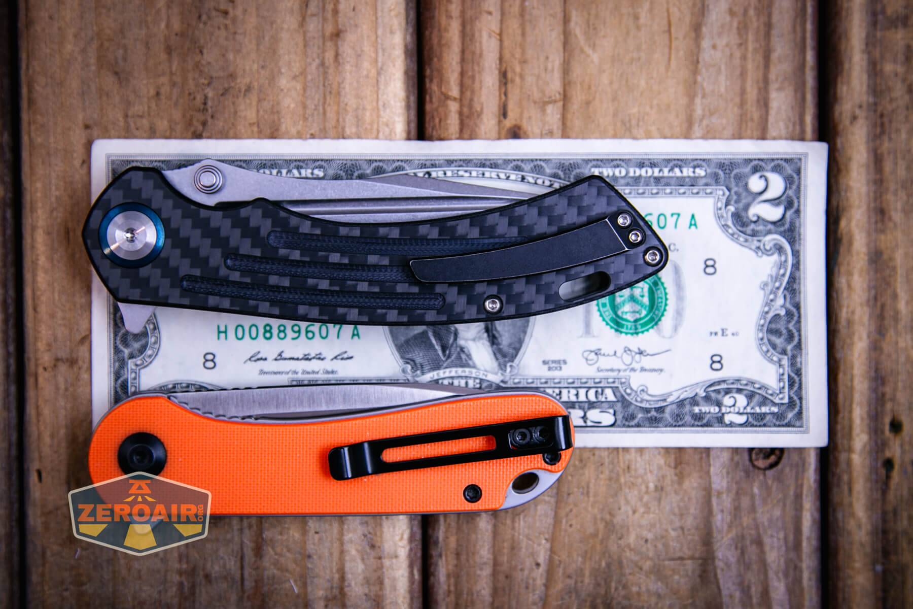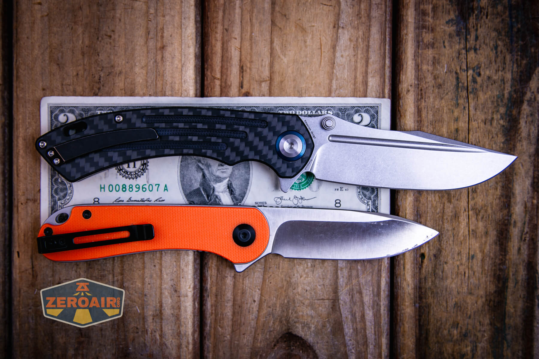 Above, you can see the Kansept Pretatout flipper knife with the Civivi Elementum in orange G10. I use that knife so much!