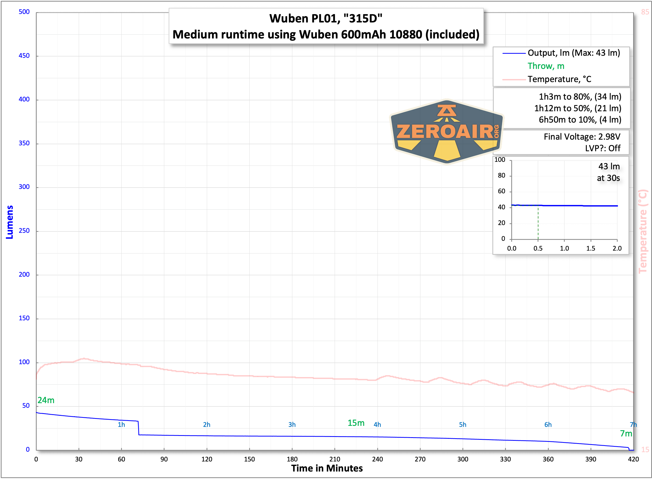 Below are a few runtime tests. There’s nothing super surprising here. Sustained output is around 100 lumens.