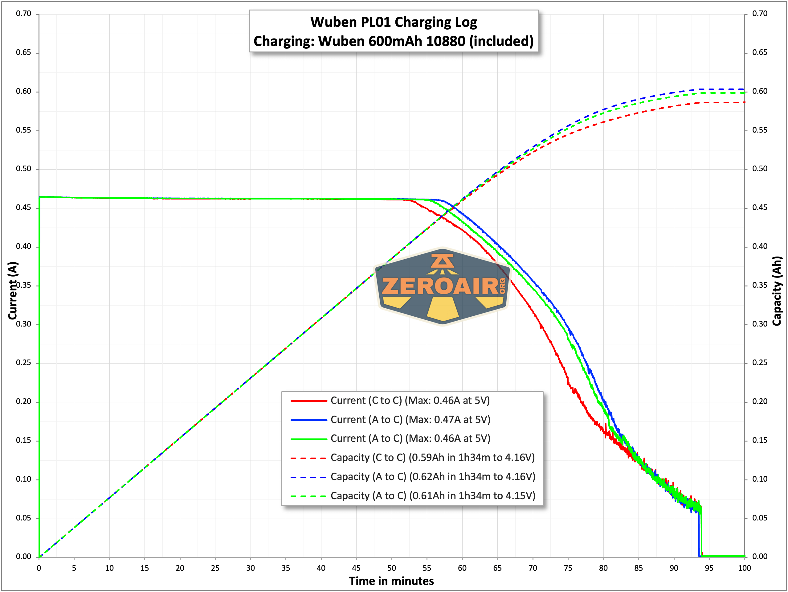 Charging works fine from C or A sources, and finishes in around an hour and a half.