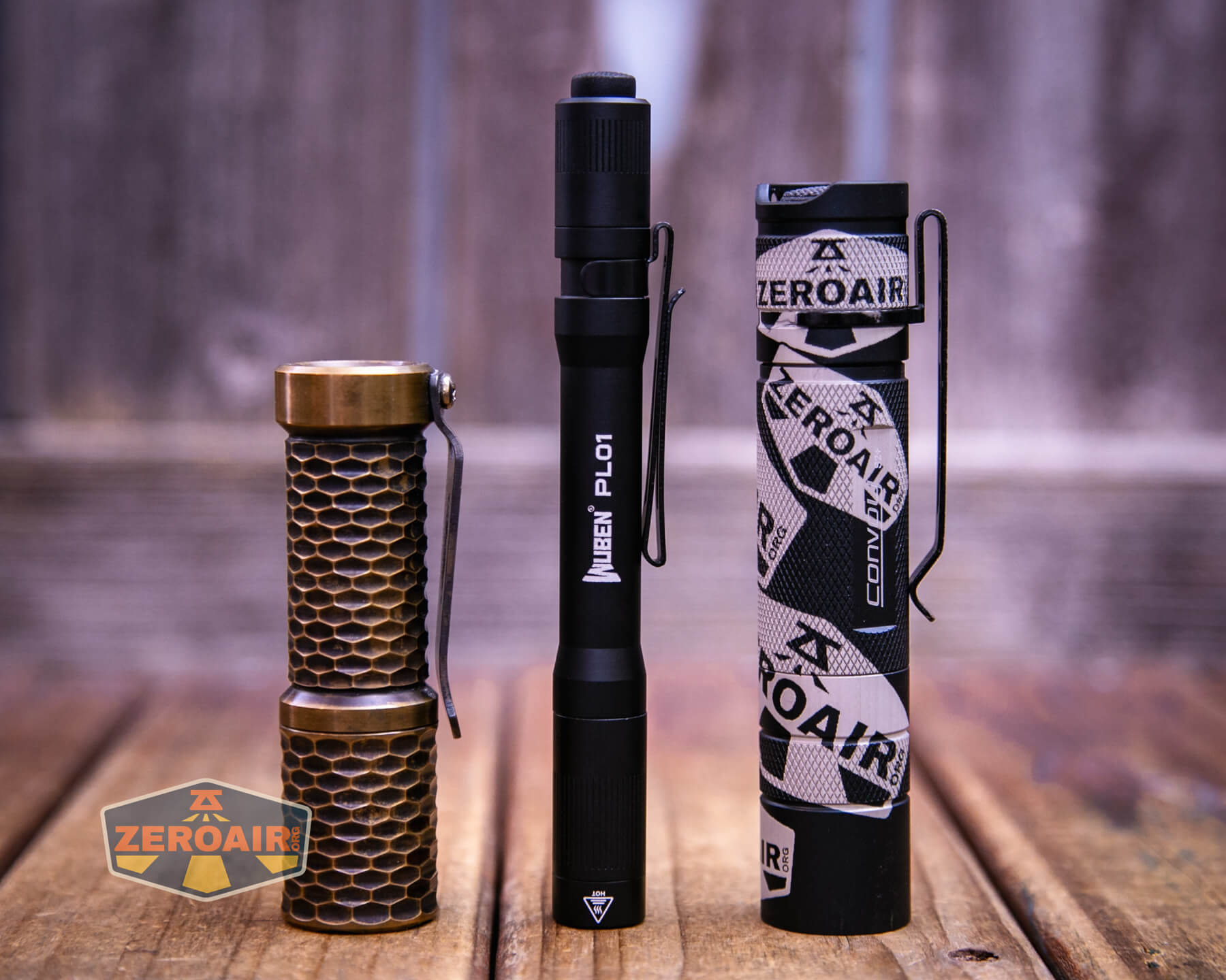 Also in the photo above, my Standard Reference Material (SRM) flashlight is the Hanko Machine Works Trident, an 18350 light. While I have not reviewed or tested the Gunner Grip version seen here, I have tested a Hanko Machine Works Trident Total Tesseract in brass. I love the Trident, and it’s a striking contrast to the inexpensive Convoy S2+, another great SRM.