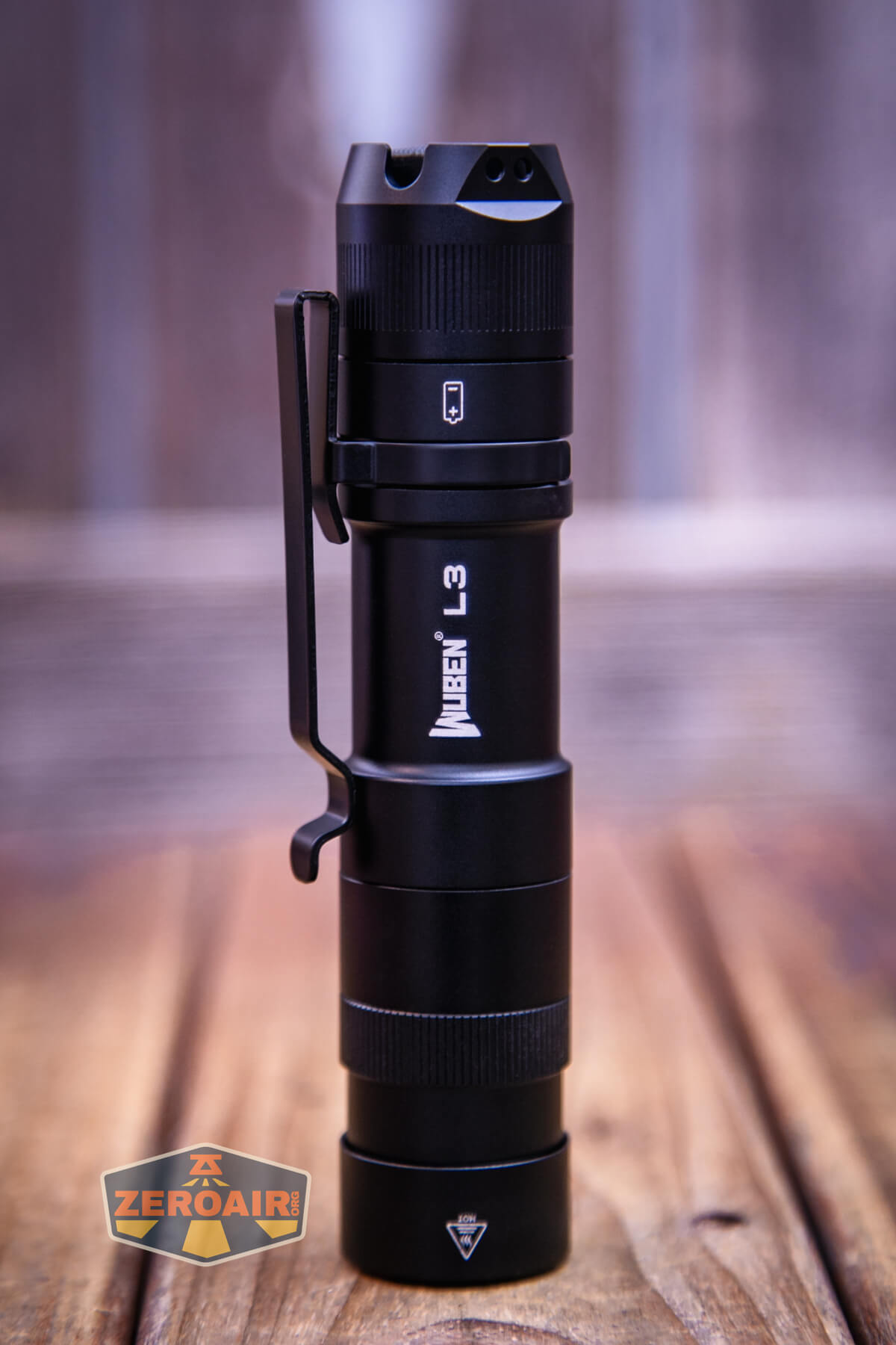 There’s a beefy belt clip that attaches only to the tail end of the Wuben L3 flashlight.