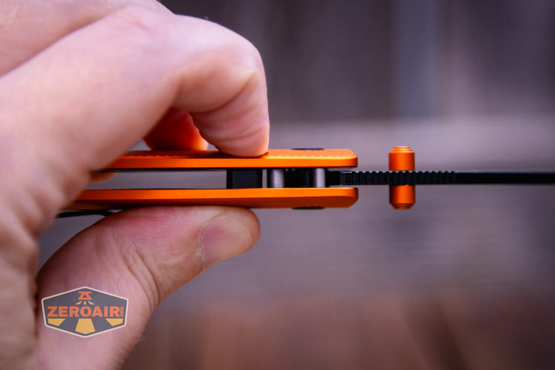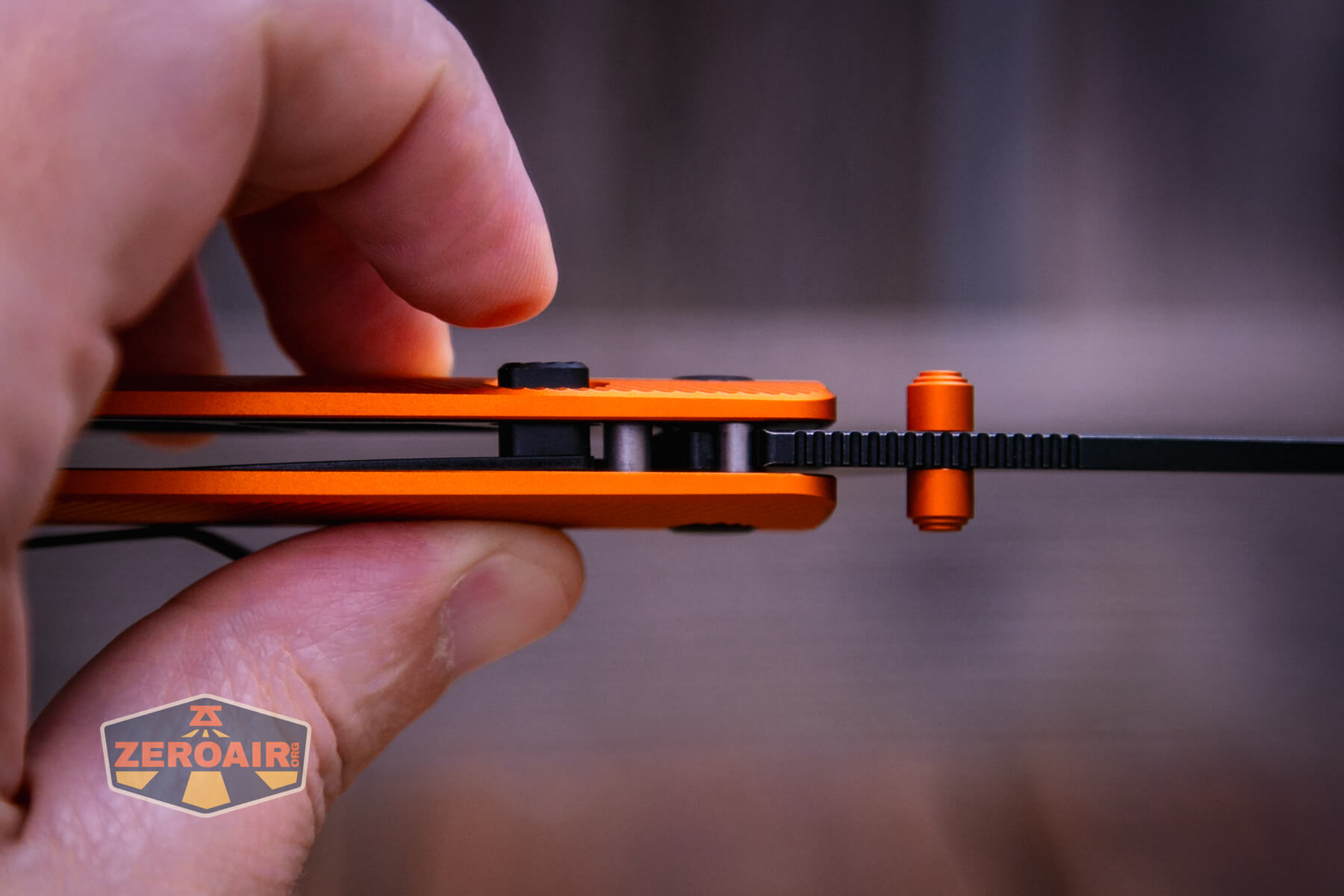 The pivot, partly visible below, uses a caged ceramic ball bearing. I’m pleased enough with the action, but I do think it’ll loosen up a bit over time and use, and that won’t be a bad thing.