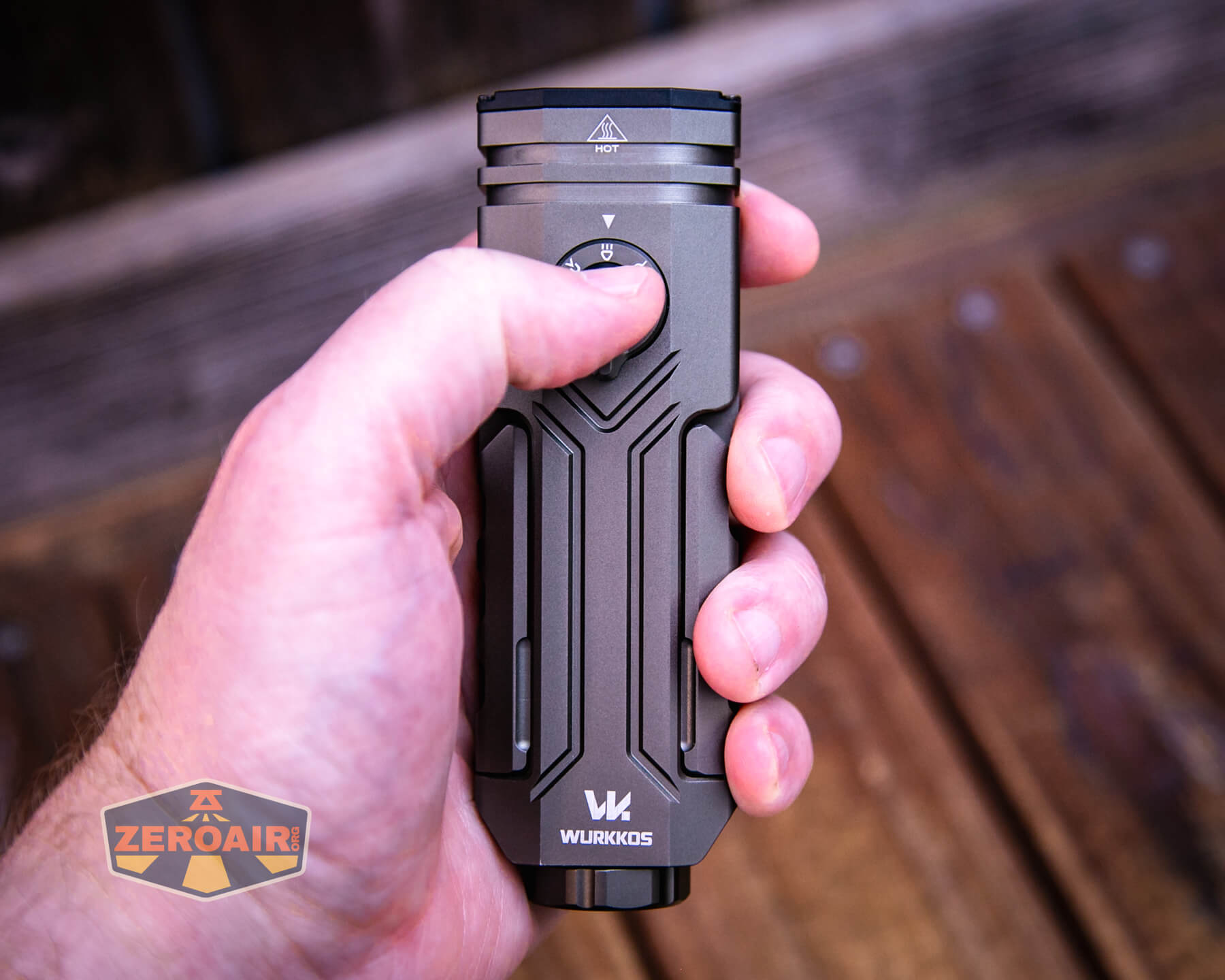 The Wurkkos HD02 four beams flashlight uses (first) a rotary selector. Next, and in the center of that rotary control, is an indicating e-switch. The rotary order is UV, LED, Laser, and does not have a lock position.