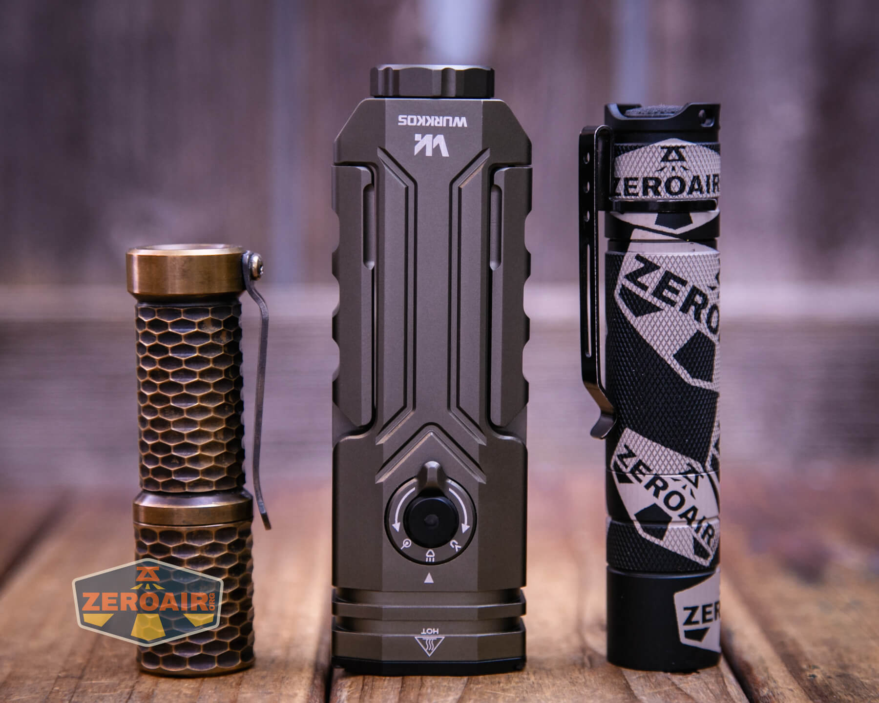 Also in the photo above, my Standard Reference Material (SRM) flashlight is the Hanko Machine Works Trident, an 18350 light. While I have not reviewed or tested the Gunner Grip version seen here, I have tested a Hanko Machine Works Trident Total Tesseract in brass. I love the Trident, and it’s a striking contrast to the inexpensive Convoy S2+, another great SRM.