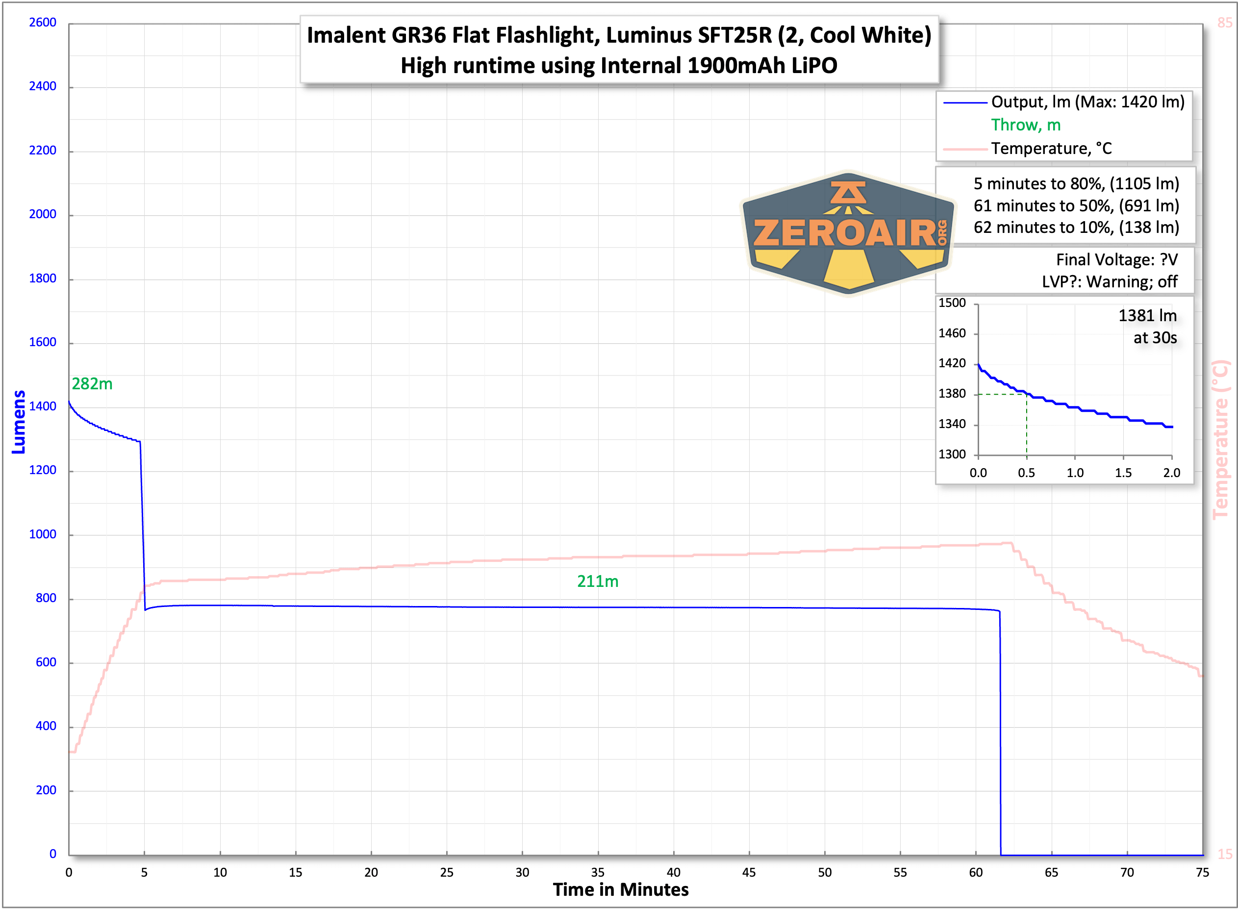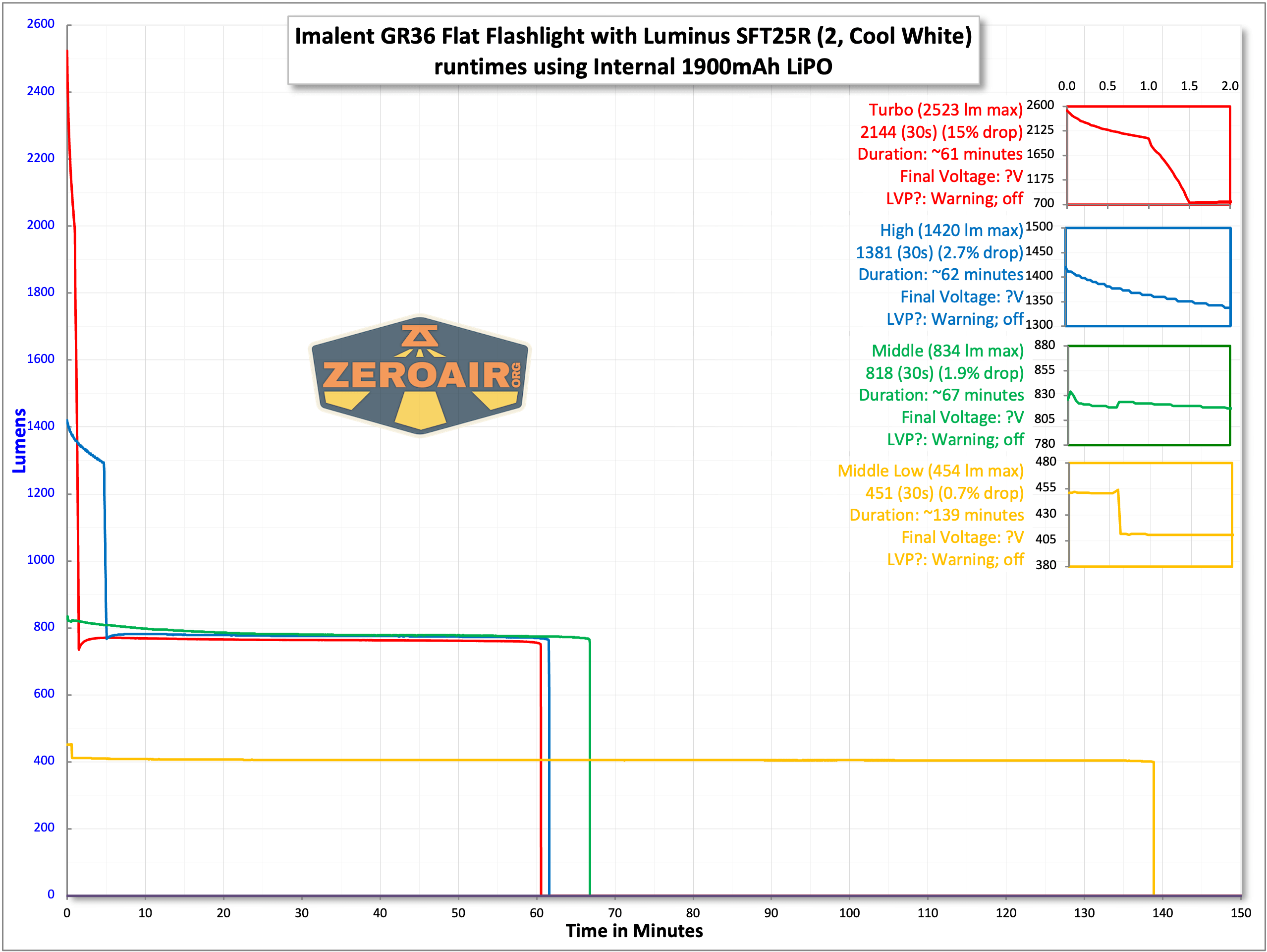 | Mode | Mode Claimed Output (lm) | Claimed Runtime | Measured Lumens |