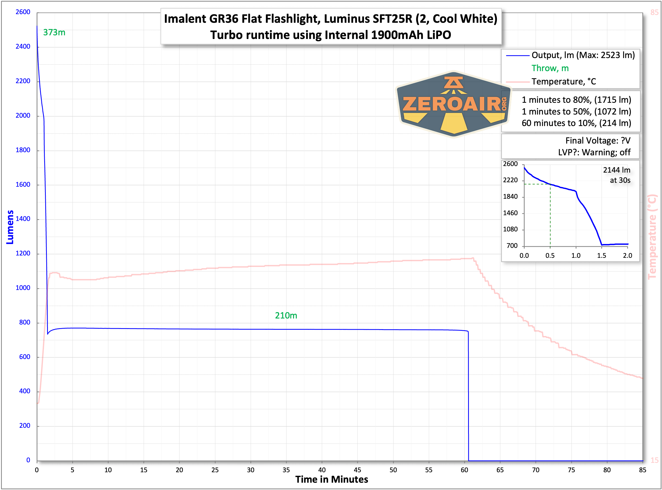 Output is claimed at 2800 lumens, and even if it hit that, it’d be brief. The stepdown from turbo happens at around a minute. Once either of the higher two modes step down, they approximately match medium level, at around 800 lumens.