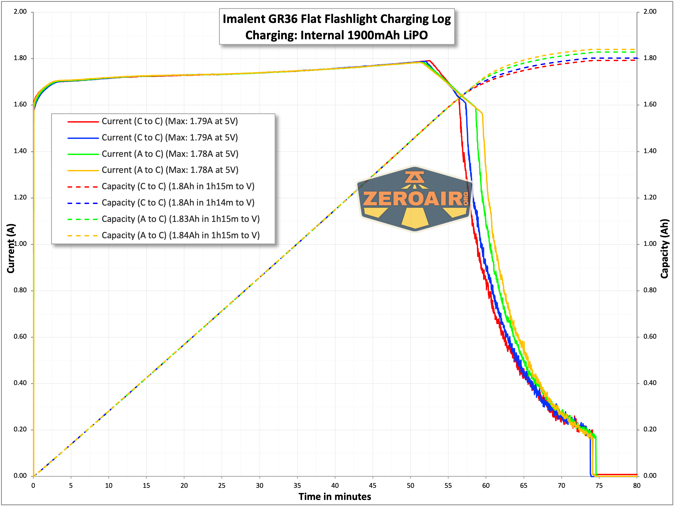 C to C and A to C work well and are both around 1.8A. That’s around 1C for this 1900mAh battery, so just right.