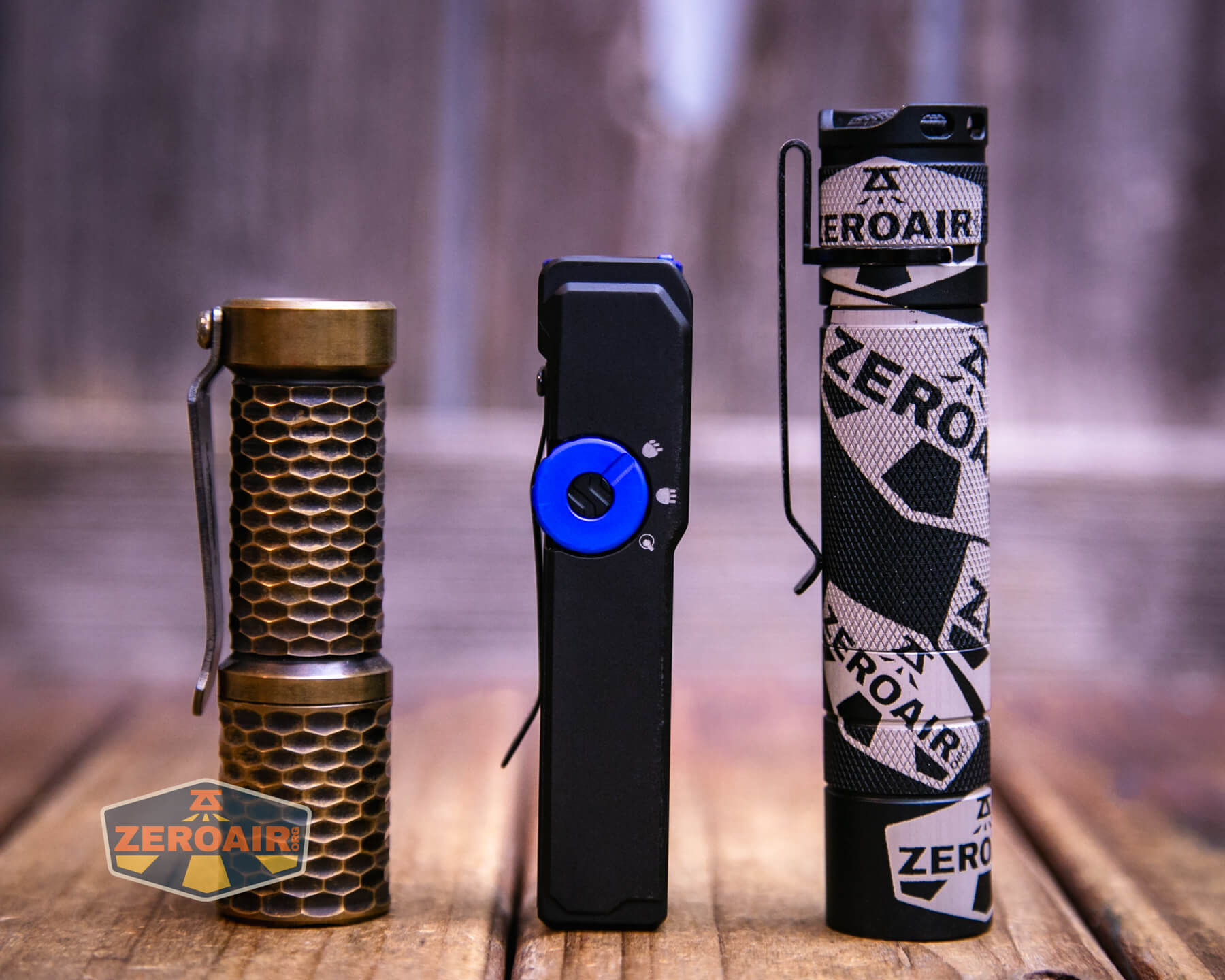 Also in the photo above, my Standard Reference Material (SRM) flashlight is the Hanko Machine Works Trident, an 18350 light. While I have not reviewed or tested the Gunner Grip version seen here, I have tested a Hanko Machine Works Trident Total Tesseract in brass. I love the Trident, and it’s a striking contrast to the inexpensive Convoy S2+, another great SRM.