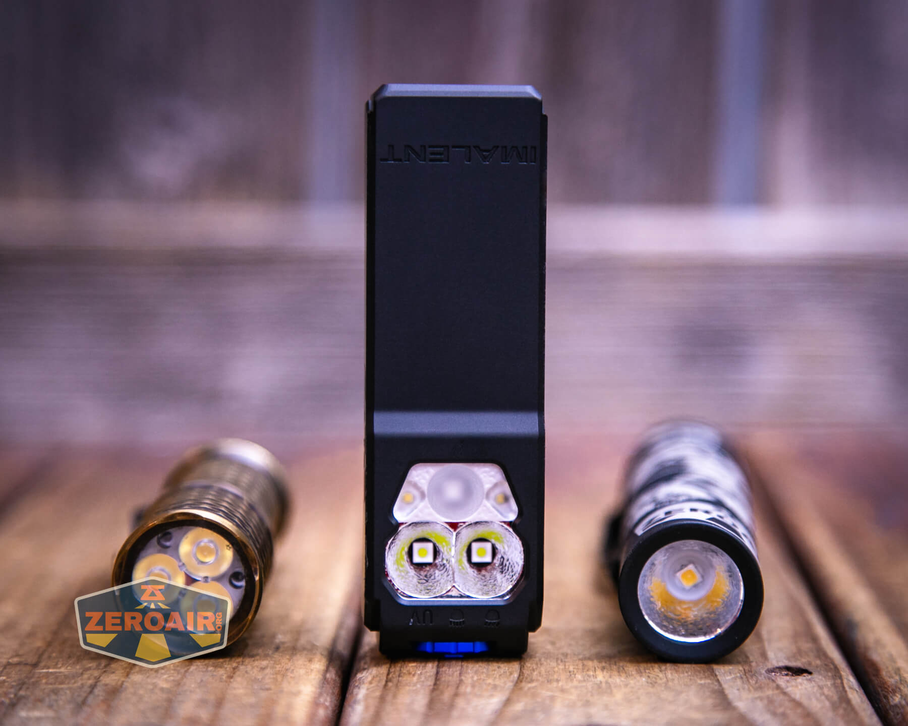 I can’t see that Imalent states what emitters are used in the GR36, but at least the main emitters appear to be Luminus SFT25R’s. They have orange peel reflectors. The warm white emitters flank the UV emitter, below the main emitters.