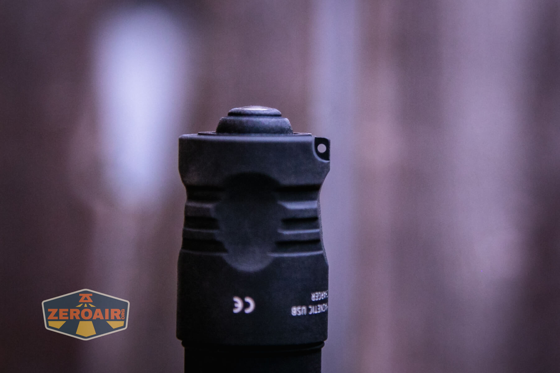 The Armytek Viking Pro Magnet USB tactical flashlight is controlled by a tail switch.
