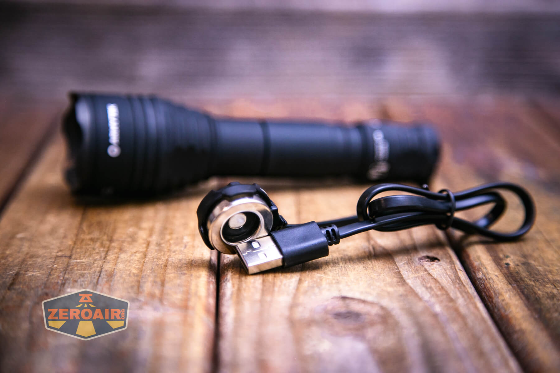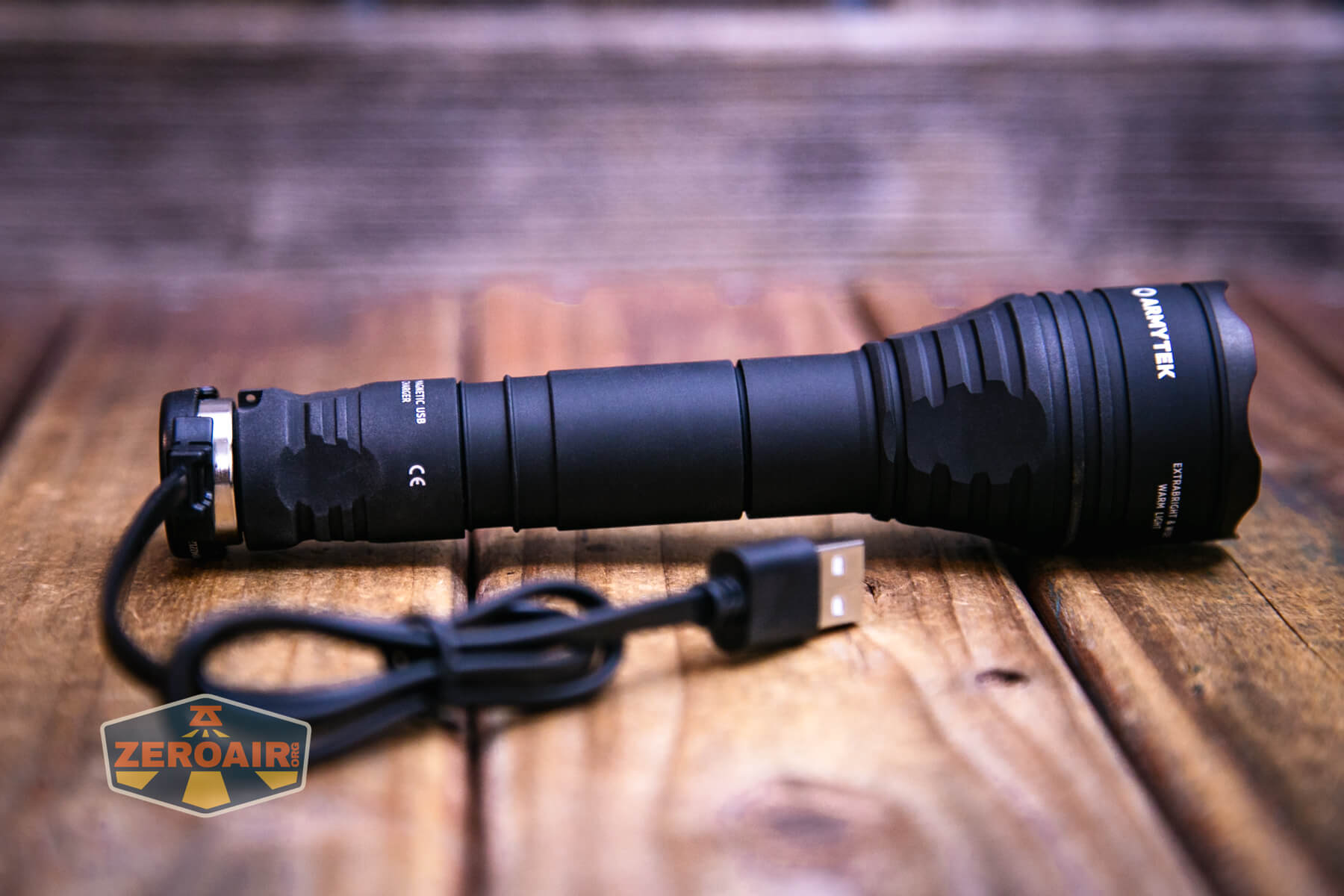The Armytek Viking Pro Magnet USB tactical flashlight includes a proprietary magnetic charging connector. The standard cell can, of course, be charged in a bay charger, too.