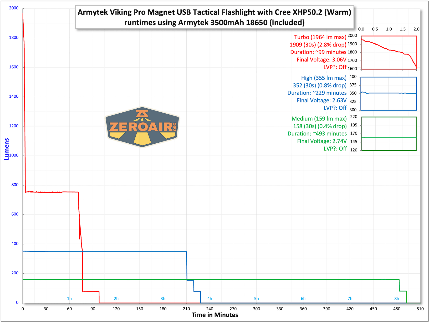 Below are three runtime tests. Output is nice and high for around a minute, then steps down. High holds very steady even at the initial output, though.