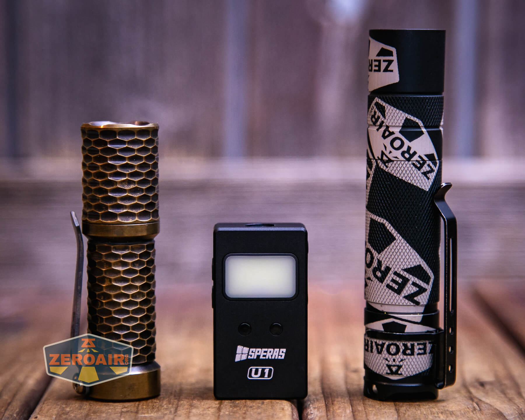 Also in the photo above, my Standard Reference Material (SRM) flashlight is the Hanko Machine Works Trident, an 18350 light. While I have not reviewed or tested the Gunner Grip version seen here, I have tested a Hanko Machine Works Trident Total Tesseract in brass. I love the Trident, and it’s a striking contrast to the inexpensive Convoy S2+, another great SRM.