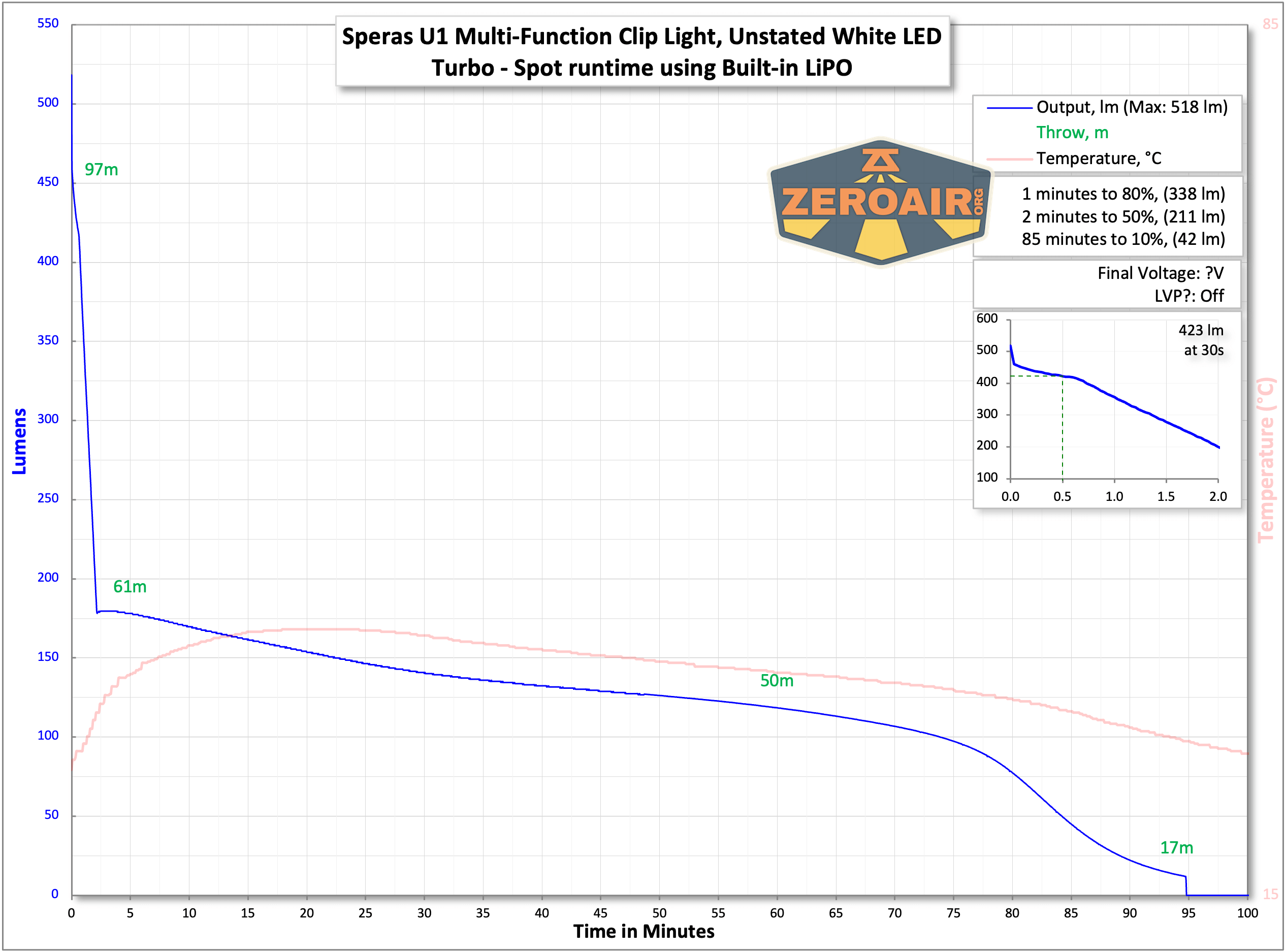 Below you can see runtime tests for the three highest spot modes and two highest flood modes. I don’t see the internal battery capacity listed anywhere in the documentation.