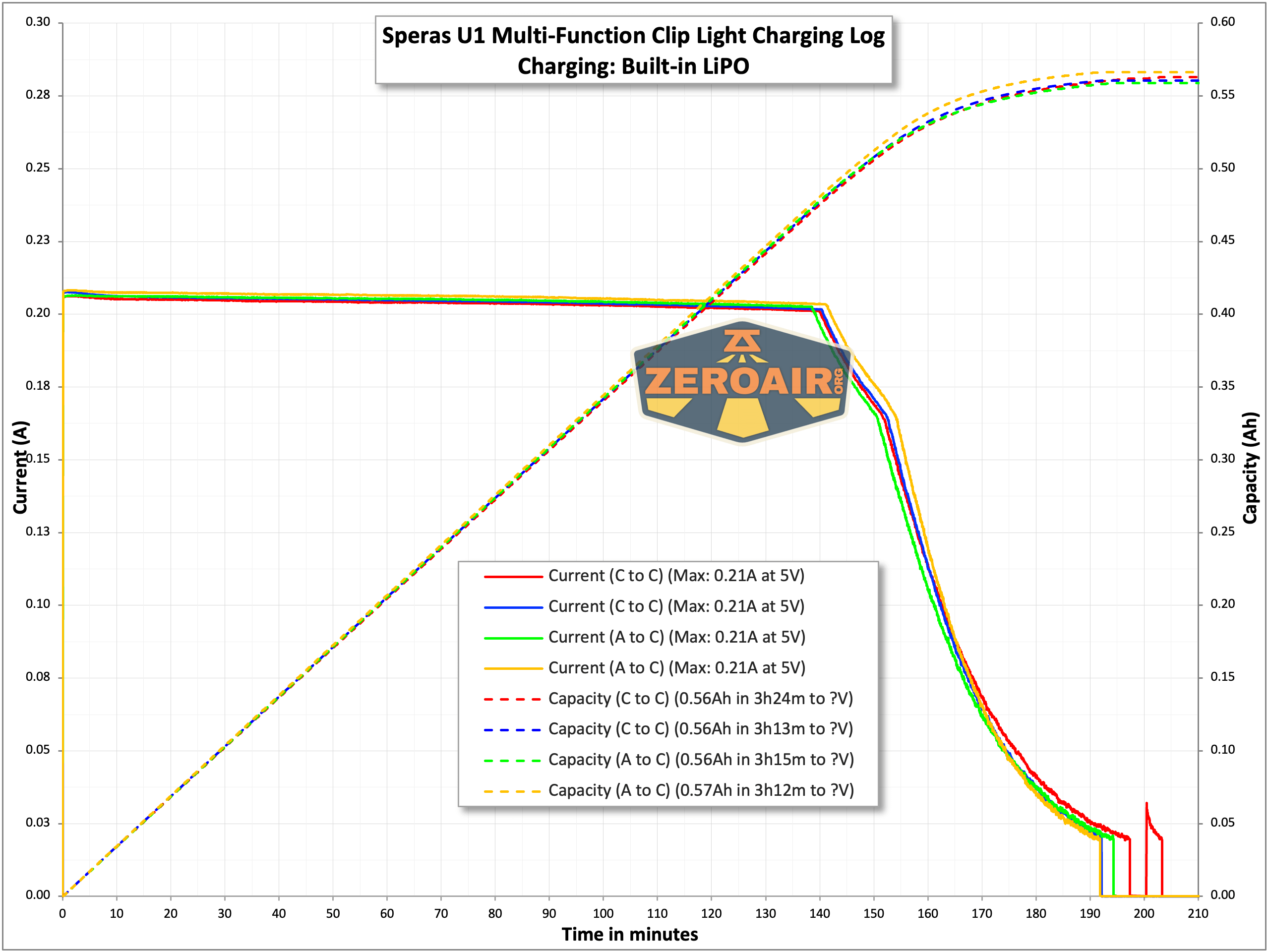 Both A to C and C to C work just fine, and have consistent performance of around 0.22A. The capacity appears to be around 0.6Ah.