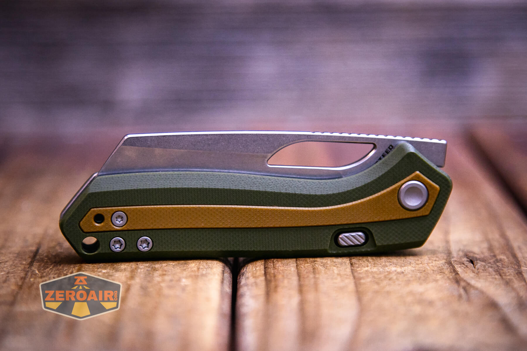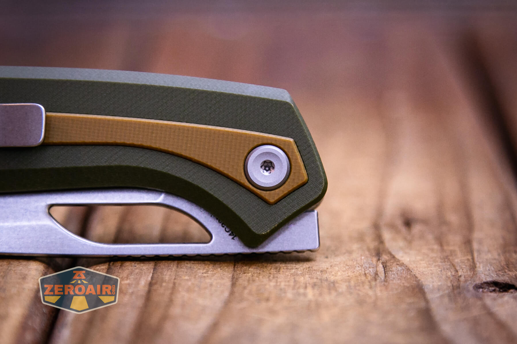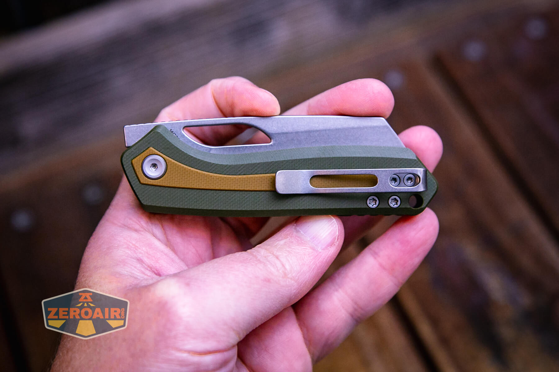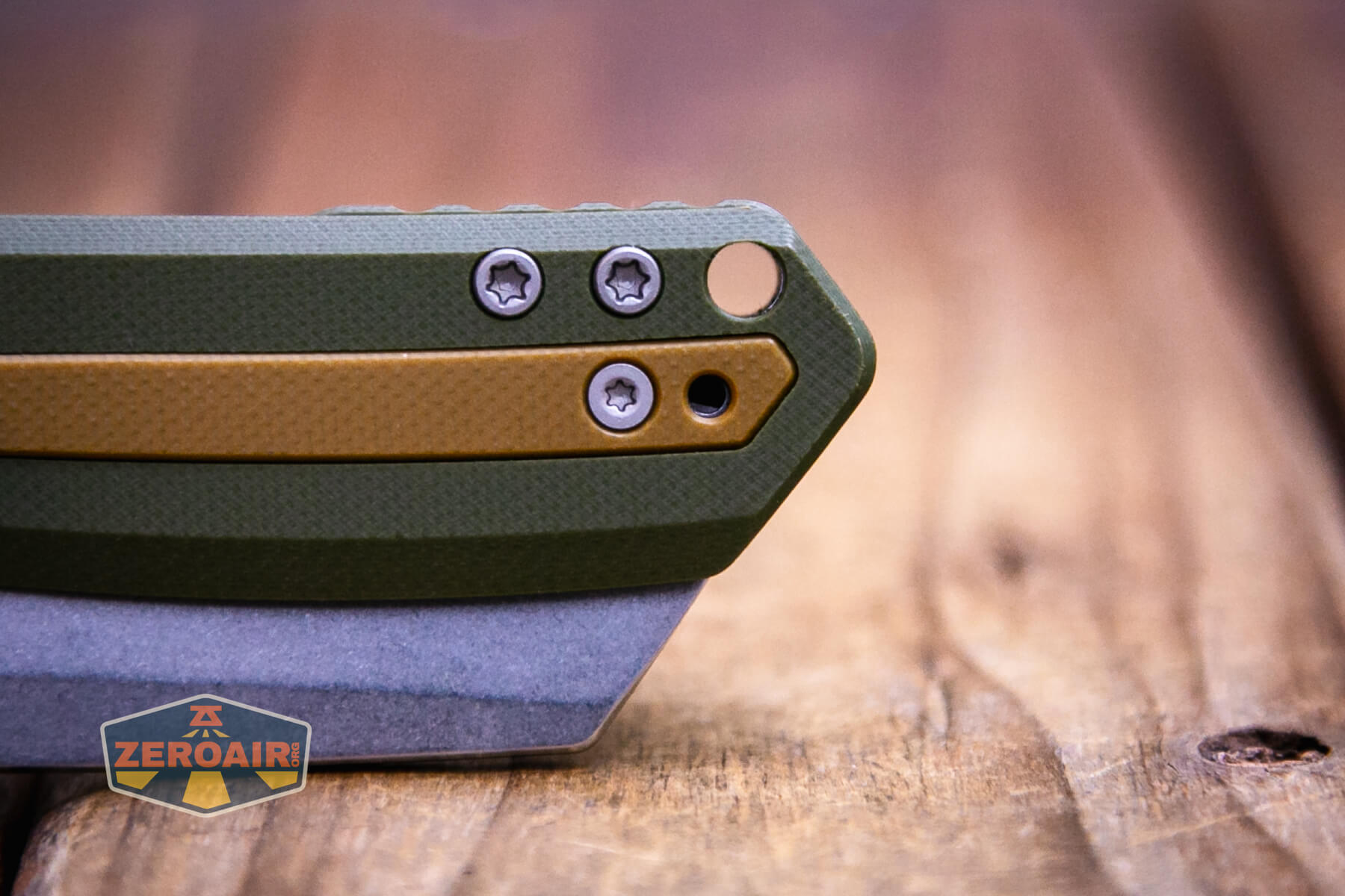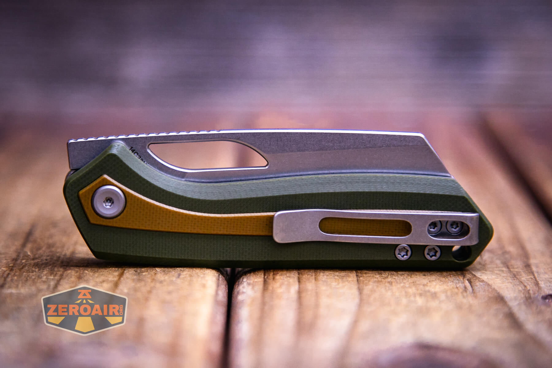 The clip is reversible. It appears my model is missing one of the clip screws, but this seems to be intentional – the product photos on Vosteed’s website also have only one screw in the Khaki part of the G10 here. Anyway, if you take the clip off the other side and move it to this side, you’ll be able to use those screws here.