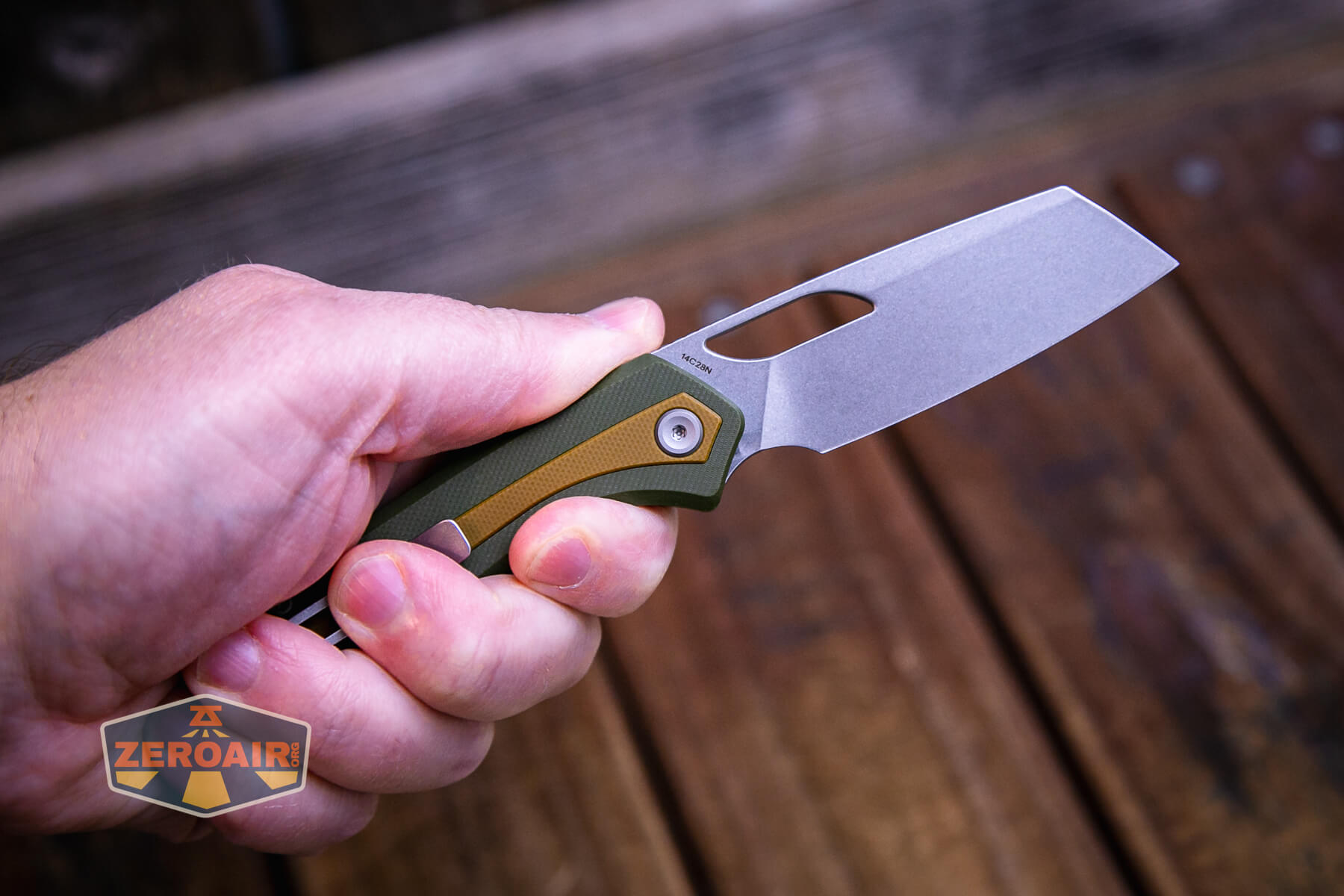 You’ll note immediately that the Vosteed Kroc Top Liner-Lock knife has a prominent sheepsfoot blade. It sticks up as a sort of “nose” when the knife is closed. It looks great!